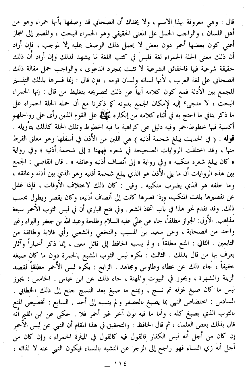 وَفِي فَتْحِ الْبَارِي أَنَّ فِي لُبْسِ الثَّوْبِ الْأَحْمَرِ سَبْعَةُ مَذَاهِبَ.