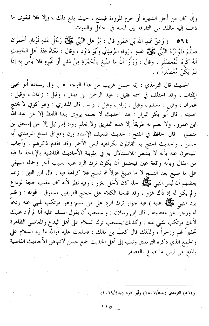 564 - (وَعَنْ عَبْدِ اللَّهِ بْنِ عَمْرٍو قَالَ: «مَرَّ عَلَى النَّبِيِّ - صَلَّى اللَّهُ عَلَيْهِ وَسَلَّمَ - رَجُلٌ عَلَيْهِ ثَوْبَانِ أَحْمَرَانِ فَسَلَّمَ فَلَمْ يَرُدَّ النَّبِيُّ - صَلَّى اللَّهُ عَلَيْهِ وَسَلَّمَ - عَلَيْهِ» . رَوَاهُ التِّرْمِذِيُّ وَأَبُو دَاوُد، وَقَالَ: مَعْنَاهُ عِنْدَ أَهْلِ الْحَدِيثِ أَنَّهُ كَرِهَ الْمُعَصْفَرَ، وَقَالَ: وَرَأَوْا أَنَّ مَا صُبِغَ بِالْحُمْرَةِ مِنْ مَدَرٍ أَوْ غَيْرِهِ فَلَا بَأْسَ بِهِ إذَا لَمْ يَكُنْ مُعَصْفَرًا) . الْحَدِيثُ قَالَ التِّرْمِذِيُّ: إنَّهُ حَسَنٌ غَرِيبٌ مِنْ هَذَا الْوَجْهِ اهـ.