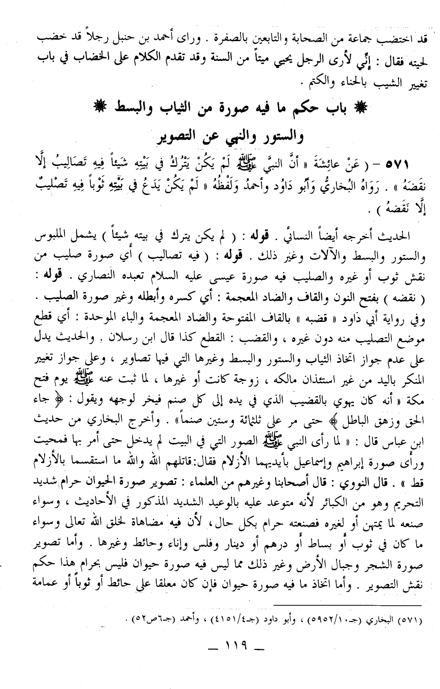 571 - (عَنْ عَائِشَةَ «أَنَّ النَّبِيَّ - صَلَّى اللَّهُ عَلَيْهِ وَسَلَّمَ - لَمْ يَكُنْ يَتْرُكْ فِي بَيْتِهِ شَيْئًا فِيهِ تَصَالِيبُ إلَّا نَقَضَهُ» . رَوَاهُ الْبُخَارِيُّ وَأَبُو دَاوُد وَأَحْمَدُ وَلَفْظُهُ " لَمْ يَكُنْ يَدَعُ فِي بَيْتِهِ ثَوْبًا فِيهِ تَصْلِيبٌ إلَّا نَقَضَهُ ") .