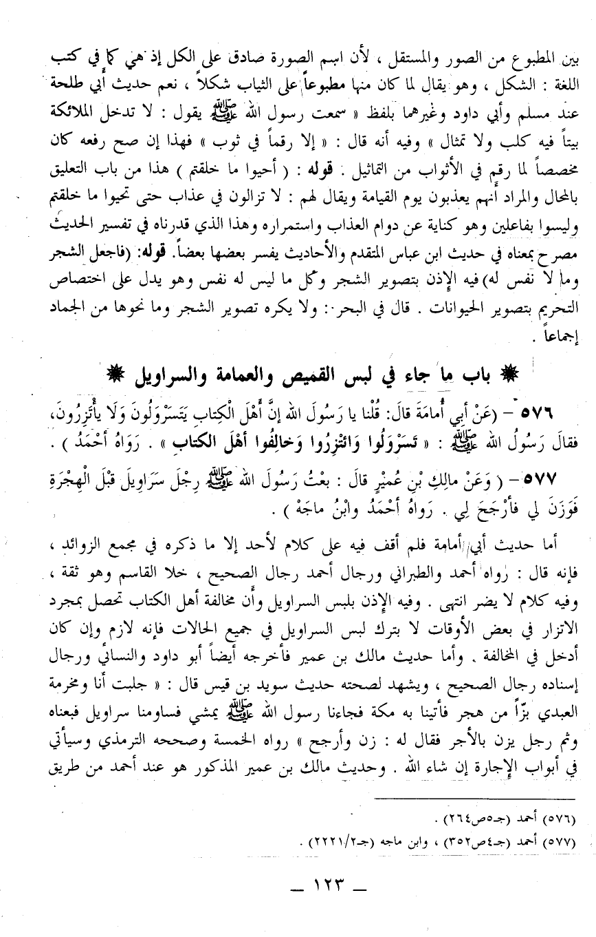 576 - (عَنْ أَبِي أُمَامَةَ قَالَ: «قُلْنَا يَا رَسُولَ اللَّهِ إنَّ أَهْلَ الْكِتَابِ يَتَسَرْوَلَونَ وَلَا يَأْتَزِرُونَ، فَقَالَ رَسُولُ اللَّهِ - صَلَّى اللَّهُ عَلَيْهِ وَسَلَّمَ -: تَسَرْوَلُوا وَائْتَزِرُوا وَخَالِفُوا أَهْلَ الْكِتَابِ» . رَوَاهُ أَحْمَدُ) .