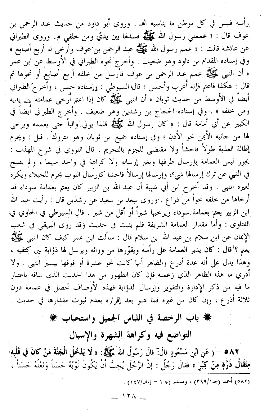 582 - (عَنْ ابْنِ مَسْعُودٍ قَالَ: قَالَ رَسُولُ اللَّهِ - صَلَّى اللَّهُ عَلَيْهِ وَسَلَّمَ -: «لَا يَدْخُلُ الْجَنَّةَ مَنْ كَانَ فِي قَلْبِهِ مِثْقَالُ ذَرَّةٍ مِنْ كِبْرٍ فَقَالَ رَجُلٌ إنَّ الرَّجُلَ يُحِبُّ أَنْ يَكُونَ ثَوْبُهُ حَسَنًا وَنَعْلُهُ حَسَنًا،