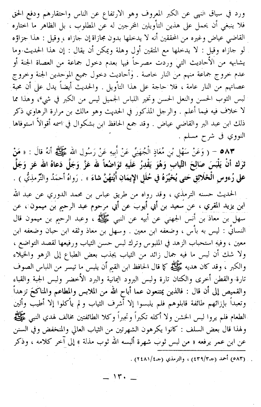 وَأَحَادِيثُ دُخُولِ جَمِيعِ الْمُوَحِّدِينَ الْجَنَّةَ وَخُرُوجِ عُصَاتِهِمْ مِنْ النَّارِ عَامَّةً، فَلَا حَاجَةَ عَلَى هَذَا التَّأْوِيلِ. وَالْحَدِيثُ أَيْضًا يَدُلُّ عَلَى أَنَّ مَحَبَّةَ لُبْسِ الثَّوْبِ الْحَسَنِ وَالنَّعْلِ الْحَسَنِ وَتَخَيُّرِ اللِّبَاسِ الْجَمِيلِ لَيْسَ مِنْ الْكِبْرِ فِي شَيْءٍ، وَهَذَا مِمَّا لَا خِلَافَ فِيهِ فِيمَا أَعْلَمُ. وَالرَّجُلُ الْمَذْكُورُ فِي الْحَدِيثِ وَهُوَ مَالِكُ بْنُ مُرَارَةَ الرَّهَاوِيُّ ذَكَرَ ذَلِكَ ابْنُ عَبْدِ الْبَرِّ وَالْقَاضِي عِيَاضٌ. وَقَدْ جَمَعَ الْحَافِظُ ابْنُ بَشْكُوَالَ فِي اسْمِهِ أَقْوَالًا اسْتَوْفَاهَا النَّوَوِيُّ فِي شَرْحِ مُسْلِمٍ.