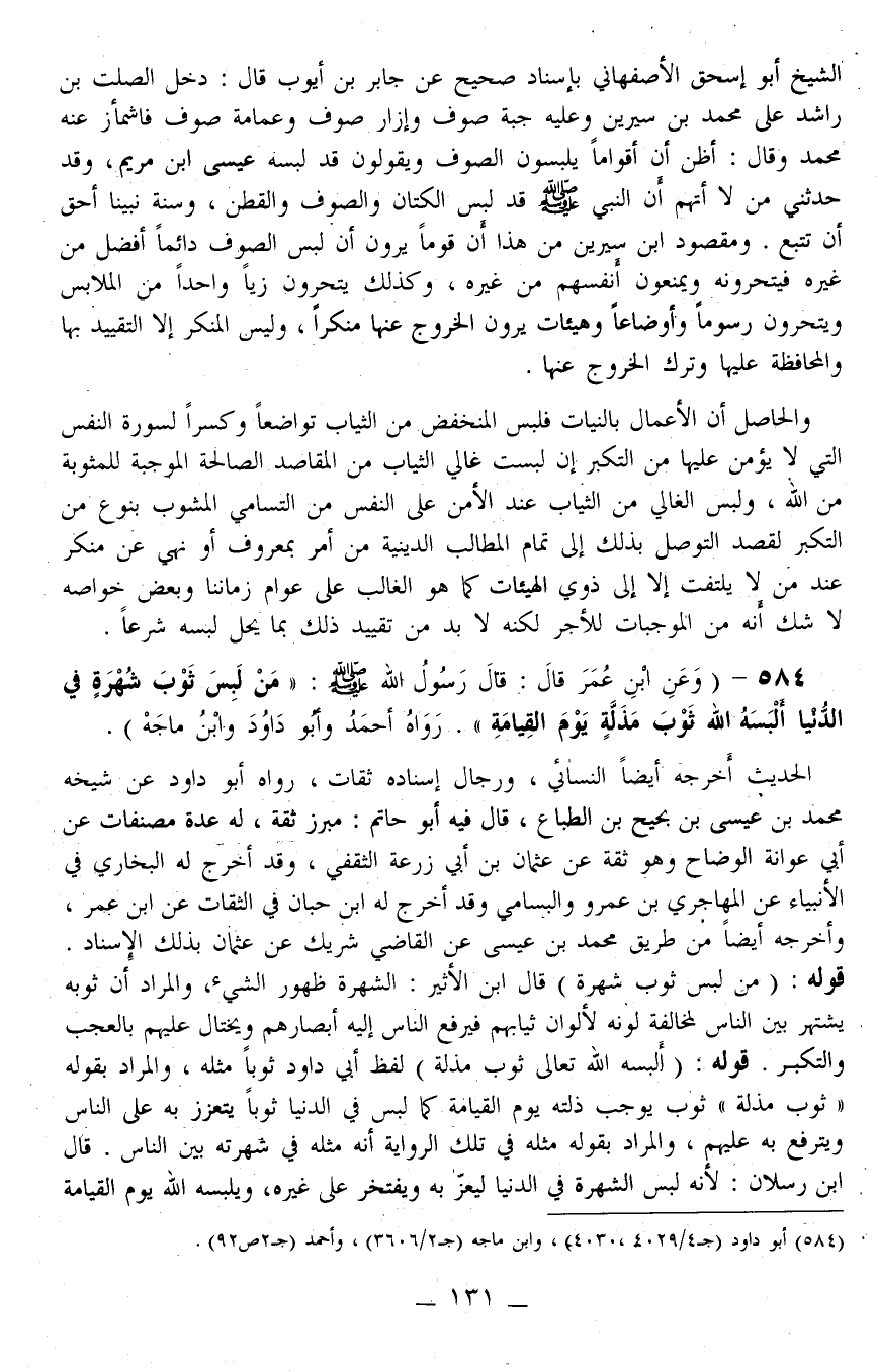 584 - (وَعَنْ ابْنِ عُمَرَ قَالَ: قَالَ رَسُولُ اللَّهِ - صَلَّى اللَّهُ عَلَيْهِ وَسَلَّمَ -: «مَنْ لَبِسَ ثَوْبَ شُهْرَةٍ فِي الدُّنْيَا أَلْبَسَهُ اللَّهُ ثَوْبَ مَذَلَّةٍ يَوْمَ الْقِيَامَةِ» . رَوَاهُ أَحْمَدُ وَأَبُو دَاوُد وَابْنُ مَاجَهْ) .