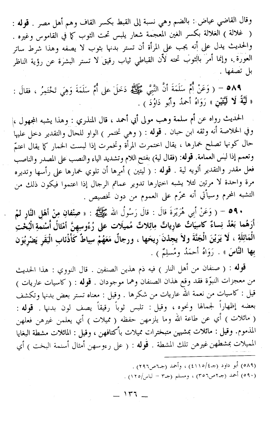 (وَعَنْ أُمِّ سَلَمَةَ «أَنَّ النَّبِيَّ - صَلَّى اللَّهُ عَلَيْهِ وَسَلَّمَ - دَخَلَ عَلَى أُمِّ سَلَمَةَ وَهِيَ تَخْتَمِرُ، فَقَالَ: لَيَّةً لَا لَيَّتَيْنِ» رَوَاهُ أَحْمَدُ وَأَبُو دَاوُد) (وَعَنْ أَبِي هُرَيْرَةَ قَالَ: قَالَ رَسُولُ اللَّهِ - صَلَّى اللَّهُ عَلَيْهِ وَسَلَّمَ -: «صِنْفَانِ مِنْ أَهْلِ النَّارِ لَمْ أَرَهُمَا بَعْدُ نِسَاءٌ كَاسِيَاتٌ عَارِيَّاتٌ مَائِلَاتٌ مُمِيلَاتٌ عَلَى رُءُوسِهِنَّ أَمْثَالُ أَسْنِمَةِ الْبُخْتِ الْمَائِلَةِ، لَا يَرَيْنَ الْجَنَّةَ وَلَا يَجِدْنَ رِيحَهَا، وَرِجَالٌ مَعَهُمْ سِيَاطٌ كَأَذْنَابِ الْبَقَرِ يَضْرِبُونَ بِهَا النَّاسَ» . رَوَاهُ أَحْمَدُ وَمُسْلِمٌ)