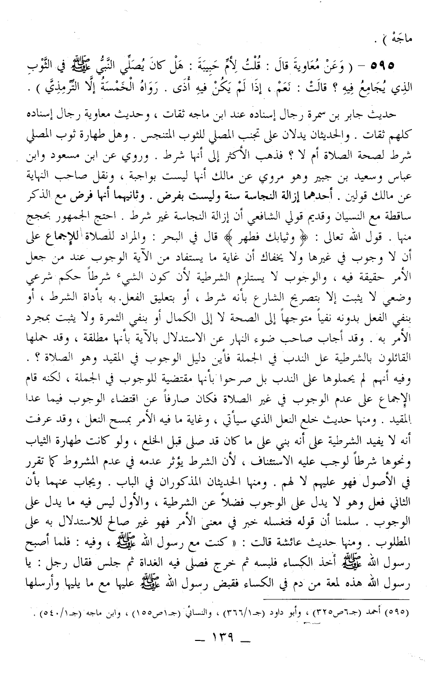595 - (وَعَنْ مُعَاوِيَةَ قَالَ: «قُلْت لِأُمِّ حَبِيبَةَ: هَلْ كَانَ يُصَلِّي النَّبِيُّ - صَلَّى اللَّهُ عَلَيْهِ وَسَلَّمَ - فِي الثَّوْبِ الَّذِي يُجَامِعُ فِيهِ؟ قَالَتْ: نَعَمْ، إذَا لَمْ يَكُنْ فِيهِ أَذًى» . رَوَاهُ الْخَمْسَةُ إلَّا التِّرْمِذِيَّ) .