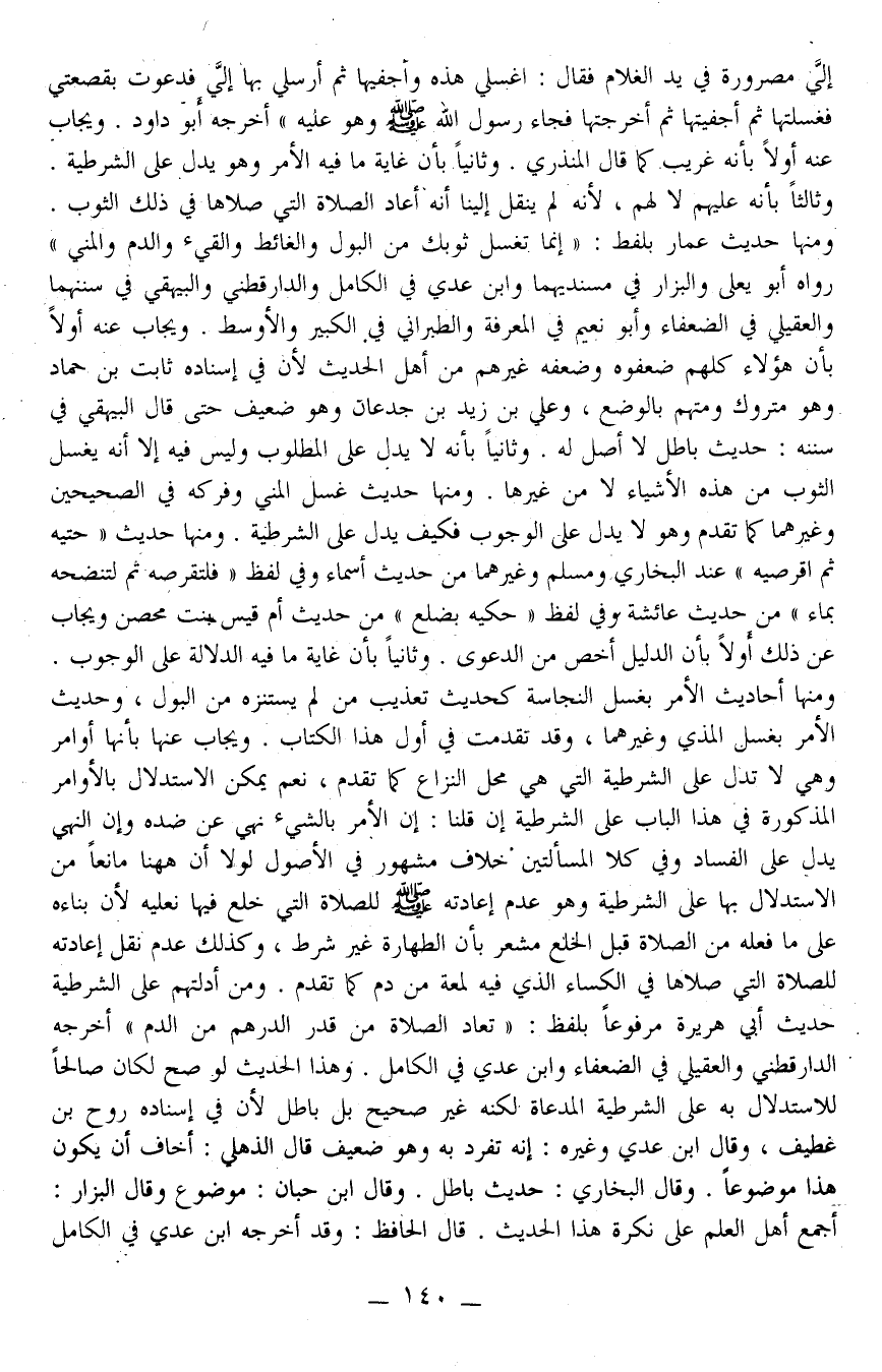 وَمِنْهَا حَدِيثُ عَمَّارٍ بِلَفْظِ: «إنَّمَا تَغْسِلُ ثَوْبَك مِنْ الْبَوْلِ وَالْغَائِطِ وَالْقَيْءِ وَالدَّمِ وَالْمَنِيِّ» رَوَاهُ أَبُو يَعْلَى وَالْبَزَّارُ فِي مُسْنَدَيْهِمَا وَابْنُ عَدِيٍّ فِي الْكَامِلِ وَالدَّارَقُطْنِيّ وَالْبَيْهَقِيُّ فِي سُنَنِهِمَا وَالْعُقَيْلِيُّ فِي الضُّعَفَاءِ وَأَبُو نُعَيْمٍ فِي الْمَعْرِفَةِ وَالطَّبَرَانِيُّ فِي الْكَبِيرِ وَالْأَوْسَطِ. وَيُجَابُ عَنْهُ أَوَّلًا بِأَنَّ هَؤُلَاءِ كُلَّهُمْ ضَعَّفُوهُ وَضَعَّفَهُ غَيْرُهُمْ مِنْ أَهْلِ الْحَدِيثِ لِأَنَّ فِي إسْنَادِهِ ثَابِتَ بْنَ حَمَّادٍ وَهُوَ مَتْرُوكٌ وَمُتَّهَمٌ بِالْوَضْعِ، وَعَلِيَّ بْنَ زَيْدِ بْنِ جُدْعَانَ وَهُوَ ضَعِيفٌ حَتَّى قَالَ الْبَيْهَقِيُّ فِي سُنَنِهِ: حَدِيثٌ بَاطِلٌ لَا أَصْلَ لَهُ. وَثَانِيًا بِأَنَّهُ لَا يَدُلَّ عَلَى الْمَطْلُوبِ وَلَيْسَ فِيهِ إلَّا أَنَّهُ يَغْسِلُ الثَّوْبَ مِنْ هَذِهِ الْأَشْيَاءِ لَا مِنْ غَيْرِهَا. وَمِنْهَا حَدِيثُ غَسْلِ الْمَنِيِّ وَفَرْكِهِ فِي الصَّحِيحَيْنِ وَغَيْرِهِمَا كَمَا تَقَدَّمَ وَهُوَ لَا يَدُلُّ عَلَى الْوُجُوبِ فَكَيْفَ يَدُلُّ عَلَى الشَّرْطِيَّةِ.