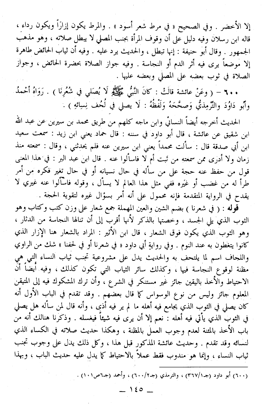 600 - (وَعَنْ عَائِشَةَ قَالَتْ: «كَانَ النَّبِيُّ - صَلَّى اللَّهُ عَلَيْهِ وَسَلَّمَ - لَا يُصَلِّي فِي شُعُرِنَا» . رَوَاهُ أَحْمَدُ وَأَبُو دَاوُد وَالتِّرْمِذِيُّ وَصَحَّحَهُ وَلَفْظُهُ: لَا يُصَلِّي فِي لُحُفِ نِسَائِهِ) . الْحَدِيثُ أَخْرَجَهُ أَيْضًا النَّسَائِيّ وَابْنُ مَاجَهْ كُلُّهُمْ مِنْ طَرِيقِ مُحَمَّدٍ بْنِ سِيرِينَ عَنْ عَبْدِ اللَّهِ بْنِ شَقِيقٍ عَنْ عَائِشَةَ، قَالَ أَبُو دَاوُد فِي سُنَنِهِ: قَالَ حَمَّادٌ يَعْنِي ابْنَ زَيْدٍ: سَمِعْت سَعِيدَ بْنَ أَبِي صَدَقَةَ قَالَ: سَأَلْت مُحَمَّدًا يَعْنِي ابْنَ سِيرِينَ عَنْهُ فَلَمْ يُحَدِّثْنِي، وَقَالَ: سَمِعْته مُنْذُ زَمَانٍ وَلَا أَدْرِي مِمَّنْ سَمِعْته مِنْ ثَبْتٍ أَمْ لَا فَاسْأَلُوا عَنْهُ. قَالَ ابْنُ عَبْدِ الْبَرِّ: فِي هَذَا الْمَعْنَى قَوْلُ مَنْ حَفِظَ عَنْهُ حُجَّةٌ عَلَى مَنْ سَأَلَهُ فِي حَالِ نِسْيَانِهِ أَوْ فِي حَالِ تَغَيُّرِ فِكْرِهِ مِنْ أَمْرٍ طَرَأَ لَهُ مِنْ غَضَبٍ أَوْ غَيْرِهِ فَفِي مِثْلِ هَذَا الْعَالِمِ لَا يُسْأَلُ، وَقَوْلُهُ فَاسْأَلُوا عَنْهُ غَيْرِي لَا يَقْدَحُ فِي الرِّوَايَةِ الْمُتَقَدِّمَةِ فَإِنَّهُ مَحْمُولٌ عَلَى أَنَّهُ أَمَرَ بِسُؤَالِ غَيْرِهِ لِتَقْوِيَةِ الْحُجَّةِ.