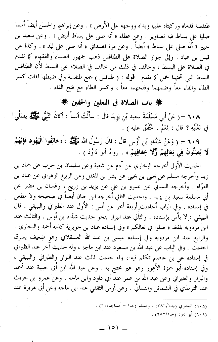 608 - (عَنْ أَبِي مَسْلَمَةُ سَعِيدِ بْنِ يَزِيدَ قَالَ: «سَأَلْت أَنَسًا: أَكَانَ النَّبِيُّ - صَلَّى اللَّهُ عَلَيْهِ وَسَلَّمَ - يُصَلِّي فِي نَعْلَيْهِ؟ قَالَ: نَعَمْ» . مُتَّفَقٌ عَلَيْهِ) .