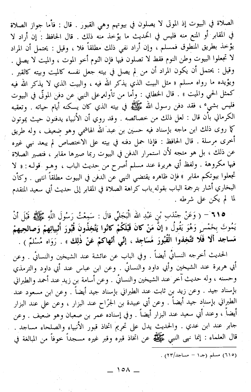 615 - (وَعَنْ جُنْدَبِ بْنِ عَبْدِ اللَّهِ الْبَجَلِيِّ قَالَ: سَمِعْت رَسُولَ اللَّهِ - صَلَّى اللَّهُ عَلَيْهِ وَسَلَّمَ - قَبْلَ أَنْ يَمُوتَ بِخَمْسٍ وَهُوَ يَقُولُ «إنَّ مَنْ كَانَ قَبْلَكُمْ كَانُوا يَتَّخِذُونَ قُبُورَ أَنْبِيَائِهِمْ مَسَاجِدَ أَلَا فَلَا تَتَّخِذُوا الْقُبُورَ مَسَاجِدَ، إنِّي أَنْهَاكُمْ عَنْ ذَلِكَ» . رَوَاهُ مُسْلِمٌ) . الْحَدِيثُ أَخْرَجَهُ النَّسَائِيّ أَيْضًا.