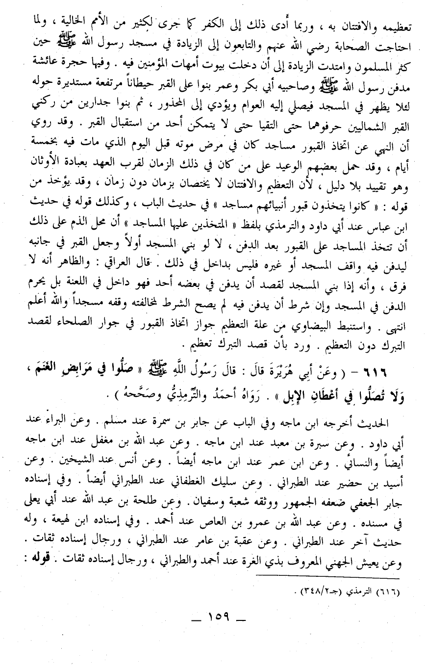 616 - (وَعَنْ أَبِي هُرَيْرَةَ قَالَ: قَالَ رَسُولُ اللَّهِ - صَلَّى اللَّهُ عَلَيْهِ وَسَلَّمَ - «صَلُّوا فِي مَرَابِضِ الْغَنَمِ، وَلَا تُصَلُّوا فِي أَعْطَانِ الْإِبِلِ» . رَوَاهُ أَحْمَدُ وَالتِّرْمِذِيُّ وَصَحَّحَهُ) .