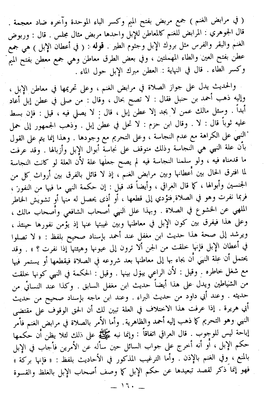 قَوْلُهُ: (فِي أَعْطَانِ الْإِبِلِ) هِيَ جَمْعُ عَطَنٍ بِفَتْحِ الْعَيْنِ وَالطَّاءِ الْمُهْمَلَتَيْنِ، وَفِي بَعْضِ الطُّرُقِ مَعَاطِنِ وَهِيَ جَمْعُ مَعْطِنٍ بِفَتْحِ الْمِيمِ وَكَسْرِ الطَّاءِ. قَالَ فِي النِّهَايَةِ: الْعَطَنُ مَبْرَكُ الْإِبِلِ حَوْلَ الْمَاءِ. وَالْحَدِيثُ يَدُلُّ عَلَى جَوَازِ الصَّلَاةِ فِي مَرَابِضِ الْغَنَمِ، وَعَلَى تَحْرِيمِهَا فِي مَعَاطِنِ الْإِبِلِ، وَإِلَيْهِ ذَهَبَ أَحْمَدُ بْنُ حَنْبَلٍ فَقَالَ: لَا تَصِحُّ بِحَالٍ، وَقَالَ: مَنْ صَلَّى فِي عَطَنِ إبِلٍ أَعَادَ أَبَدًا. وَسُئِلَ مَالِكٌ عَمَّنْ لَا يَجِدُ إلَّا عَطَنَ إبِلٍ، قَالَ: لَا يُصَلِّي فِيهِ، قِيلَ: فَإِنْ بَسَطَ عَلَيْهِ ثَوْبًا قَالَ: لَا. وَقَالَ ابْنُ حَزْمٍ: لَا تَحِلُّ فِي عَطَنِ إبِلٍ. وَذَهَبَ الْجُمْهُورُ إلَى حَمْلِ النَّهْيِ عَلَى الْكَرَاهَةِ مَعَ عَدَمِ النَّجَاسَةِ، وَعَلَى التَّحْرِيمِ مَعَ وُجُودِهَا. وَهَذَا إنَّمَا يَتِمُّ عَلَى الْقَوْلِ بِأَنَّ عِلَّةَ النَّهْيِ هِيَ النَّجَاسَةُ وَذَلِكَ مُتَوَقِّفٌ عَلَى نَجَاسَةِ أَبْوَالِ الْإِبِلِ وَأَزْبَالِهَا.