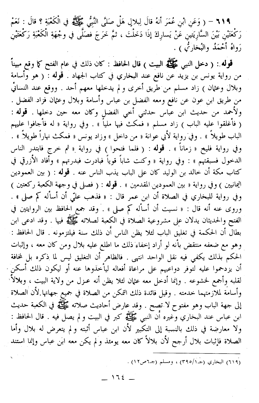 619 - (وَعَنْ ابْنِ عُمَرَ أَنَّهُ قَالَ لِبِلَالٍ «هَلْ صَلَّى النَّبِيُّ - صَلَّى اللَّهُ عَلَيْهِ وَسَلَّمَ - فِي الْكَعْبَةِ؟ قَالَ: نَعَمْ رَكْعَتَيْنِ بَيْنَ السَّارِيَتَيْنِ عَنْ يَسَارِك إذَا دَخَلْت، ثُمَّ خَرَجَ فَصَلَّى فِي وُجْهَةِ الْكَعْبَةِ رَكْعَتَيْنِ» رَوَاهُ أَحْمَدُ وَالْبُخَارِيُّ) .