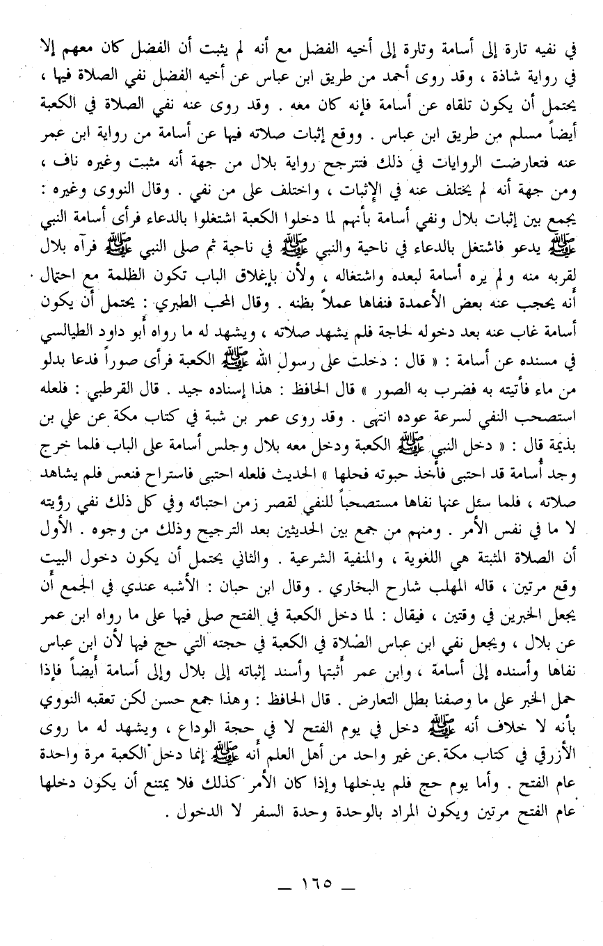 وَقَدْ رَوَى أَحْمَدُ مِنْ طَرِيقِ ابْنِ عَبَّاسٍ عَنْ أَخِيهِ الْفَضْلِ نَفْيَ الصَّلَاةِ فِيهَا، يَحْتَمِلُ أَنْ يَكُونَ تَلَقَّاهُ عَنْ أُسَامَةَ فَإِنَّهُ كَانَ مَعَهُ. وَقَدْ رَوَى عَنْهُ نَفْيَ الصَّلَاةِ فِي الْكَعْبَةِ أَيْضًا مُسْلِمٌ مِنْ طَرِيقِ ابْنِ عَبَّاسٍ. وَوَقَعَ إثْبَاتُ صَلَاتِهِ فِيهَا عَنْ أُسَامَةَ مِنْ رِوَايَةِ ابْنِ عُمَرَ عَنْهُ فَتَعَارَضَتْ الرِّوَايَاتُ فِي ذَلِكَ فَتَتَرَجَّحُ رِوَايَةُ بِلَالٍ مِنْ جِهَةِ أَنَّهُ مُثْبِتٌ وَغَيْرُهُ نَافٍ، وَمِنْ جِهَةٍ أَنَّهُ لَمْ يَخْتَلِفْ عَنْهُ فِي الْإِثْبَاتِ، وَاخْتُلِفَ عَلَى مَنْ نَفَى. وَقَالَ النَّوَوِيُّ وَغَيْرُهُ: يُجْمَعُ بَيْنَ إثْبَاتِ بِلَالٍ وَنَفْيِ أُسَامَةُ بِأَنَّهُمْ لَمَّا دَخَلُوا الْكَعْبَةَ اشْتَغَلُوا بِالدُّعَاءِ فَرَأَى أُسَامَةُ النَّبِيَّ - صَلَّى اللَّهُ عَلَيْهِ وَسَلَّمَ - يَدْعُو فَاشْتَغَلَ بِالدُّعَاءِ فِي نَاحِيَةٍ وَالنَّبِيُّ - صَلَّى اللَّهُ عَلَيْهِ وَسَلَّمَ - فِي نَاحِيَةٍ ثُمَّ صَلَّى النَّبِيُّ - صَلَّى اللَّهُ عَلَيْهِ وَسَلَّمَ - فَرَآهُ بِلَالٌ لِقُرْبِهِ مِنْهُ وَلَمْ يَرَهُ أُسَامَةُ لِبُعْدِهِ وَاشْتِغَالِهِ، وَلِأَنَّ بِإِغْلَاقِ الْبَابِ تَكُونُ الظُّلْمَةُ مَعَ احْتِمَالِ أَنَّهُ يَحْجُبُ عَنْهُ بَعْضَ الْأَعْمِدَةِ فَنَفَاهَا عَمَلًا بِظَنِّهِ.