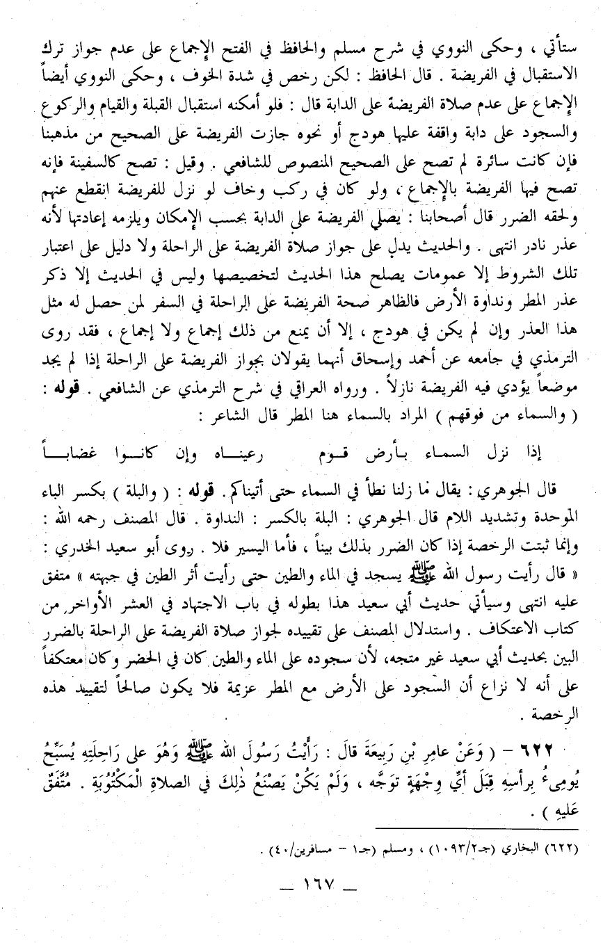 قَالَ الْحَافِظُ: لَكِنْ رُخِّصَ فِي شِدَّةِ الْخَوْفِ، وَحَكَى النَّوَوِيُّ أَيْضًا الْإِجْمَاعَ عَلَى عَدَمِ صَلَاةِ الْفَرِيضَةِ عَلَى الدَّابَّةِ قَالَ: فَلَوْ أَمْكَنَهُ اسْتِقْبَالُ الْقِبْلَةِ وَالْقِيَامُ وَالرُّكُوعُ وَالسُّجُودُ عَلَى دَابَّةٍ وَاقِفَةٍ عَلَيْهَا هَوْدَجٌ أَوْ نَحْوُهُ جَازَتْ الْفَرِيضَةُ عَلَى الصَّحِيحِ مِنْ مَذْهَبِنَا فَإِنْ كَانَتْ سَائِرَةً لَمْ تَصِحَّ عَلَى الصَّحِيحِ الْمَنْصُوصِ لِلشَّافِعِي. وَقِيلَ: تَصِحُّ كَالسَّفِينَةِ فَإِنَّهُ تَصِحُّ فِيهَا الْفَرِيضَةُ بِالْإِجْمَاعِ، وَلَوْ كَانَ فِي رَكْبٍ وَخَافَ لَوْ نَزَلَ لِلْفَرِيضَةِ انْقَطَعَ عَنْهُمْ وَلَحِقَهُ الضَّرَرُ قَالَ أَصْحَابُنَا: يُصَلِّي الْفَرِيضَةَ عَلَى الدَّابَّةِ بِحَسَبِ الْإِمْكَانِ وَيَلْزَمُهُ إعَادَتُهَا لِأَنَّهُ عُذْرٌ نَادِرٌ انْتَهَى. وَالْحَدِيثُ يَدُلُّ عَلَى جَوَازِ صَلَاةِ الْفَرِيضَةِ عَلَى الرَّاحِلَةِ وَلَا دَلِيلَ عَلَى اعْتِبَارِ تِلْكَ الشُّرُوطِ إلَّا عُمُومَاتِ يَصْلُحُ هَذَا الْحَدِيثُ لِتَخْصِيصِهَا وَلَيْسَ فِي الْحَدِيثِ إلَّا ذِكْرُ عُذْرِ الْمَطَرِ وَنَدَاوَةِ الْأَرْضِ فَالظَّاهِرُ صِحَّةُ الْفَرِيضَةِ عَلَى الرَّاحِلَةِ فِي السَّفَرِ لِمَنْ حَصَلَ لَهُ مِثْلُ هَذَا الْعُذْرِ وَإِنْ لَمْ يَكُنْ فِي هَوْدَجٍ، إلَّا أَنْ يَمْنَعَ مِنْ ذَلِكَ إجْمَاعٌ وَلَا إجْمَاعَ، فَقَدْ رَوَى التِّرْمِذِيُّ فِي جَامِعِهِ عَنْ أَحْمَدَ وَإِسْحَاقَ أَنَّهُمَا يَقُولَانِ بِجَوَازِ الْفَرِيضَةِ عَلَى الرَّاحِلَةِ إذَا لَمْ يَجِدْ مَوْضِعًا يُؤَدِّي فِيهِ الْفَرِيضَةَ نَازِلًا. وَرَوَاهُ الْعِرَاقِيُّ فِي شَرْحِ التِّرْمِذِيِّ عَنْ الشَّافِعِيِّ.