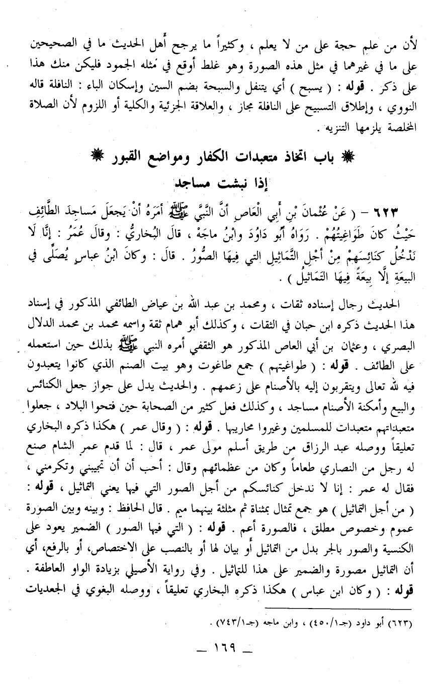 الْحَدِيثُ رِجَالُ إسْنَادِهِ ثِقَاتٌ، وَمُحَمَّدُ بْنُ عَبْدِ اللَّهِ بْنِ عِيَاضٍ الطَّائِفِيُّ الْمَذْكُورُ فِي إسْنَادِ هَذَا الْحَدِيثِ ذَكَرَهُ ابْنُ حِبَّانَ فِي الثِّقَاتِ، وَكَذَلِكَ أَبُو هَمَّامٍ ثِقَةٌ وَاسْمُهُ مُحَمَّدُ بْنُ مُحَمَّدٍ الدَّلَّالُ الْبَصْرِيُّ، وَعُثْمَانُ بْنُ أَبِي الْعَاصِ الْمَذْكُورُ هُوَ الثَّقَفِيُّ أَمَرَهُ النَّبِيُّ - صَلَّى اللَّهُ عَلَيْهِ وَسَلَّمَ - بِذَلِكَ حِينَ اسْتَعْمَلَهُ عَلَى الطَّائِفِ. قَوْلُهُ: (طَوَاغِيتُهُمْ) جَمْعُ طَاغُوتٍ وَهُوَ بَيْتُ الصَّنَمِ الَّذِي كَانُوا يَتَعَبَّدُونَ فِيهِ لِلَّهِ تَعَالَى وَيَتَقَرَّبُونَ إلَيْهِ بِالْأَصْنَامِ عَلَى زَعْمِهِمْ. وَالْحَدِيثُ يَدُلُّ عَلَى جَوَازِ جَعْلِ الْكَنَائِسِ وَالْبِيَعِ وَأَمْكِنَةِ الْأَصْنَامِ مَسَاجِدَ، وَكَذَلِكَ فَعَلَ كَثِيرٌ مِنْ الصَّحَابَةِ حِينَ فَتَحُوا الْبِلَادَ، جَعَلُوا مُتَعَبَّدَاتِهِمْ مُتَعَبَّدَاتٍ لِلْمُسْلِمِينَ وَغَيَّرُوا مَحَارِيبَهَا. قَوْلُهُ: (وَقَالَ عُمَرُ) هَكَذَا ذَكَرَهُ الْبُخَارِيُّ تَعْلِيقًا وَوَصَلَهُ عَبْدُ الرَّزَّاقِ مِنْ طَرِيقِ أَسْلَمَ مَوْلَى عُمَرَ، قَالَ: لَمَّا قَدِمَ عُمَرُ الشَّامَ صَنَعَ لَهُ رَجُلٌ مِنْ النَّصَارَى طَعَامًا وَكَانَ مِنْ عُظَمَائِهِمْ وَقَالَ: أُحِبُّ أَنْ تُجِيبَنِي وَتُكْرِمَنِي، فَقَالَ لَهُ عُمَرُ: إنَّا لَا نَدْخُلُ كَنَائِسَكُمْ مِنْ أَجْلِ الصُّوَرِ الَّتِي فِيهَا يَعْنِي التَّمَاثِيلَ