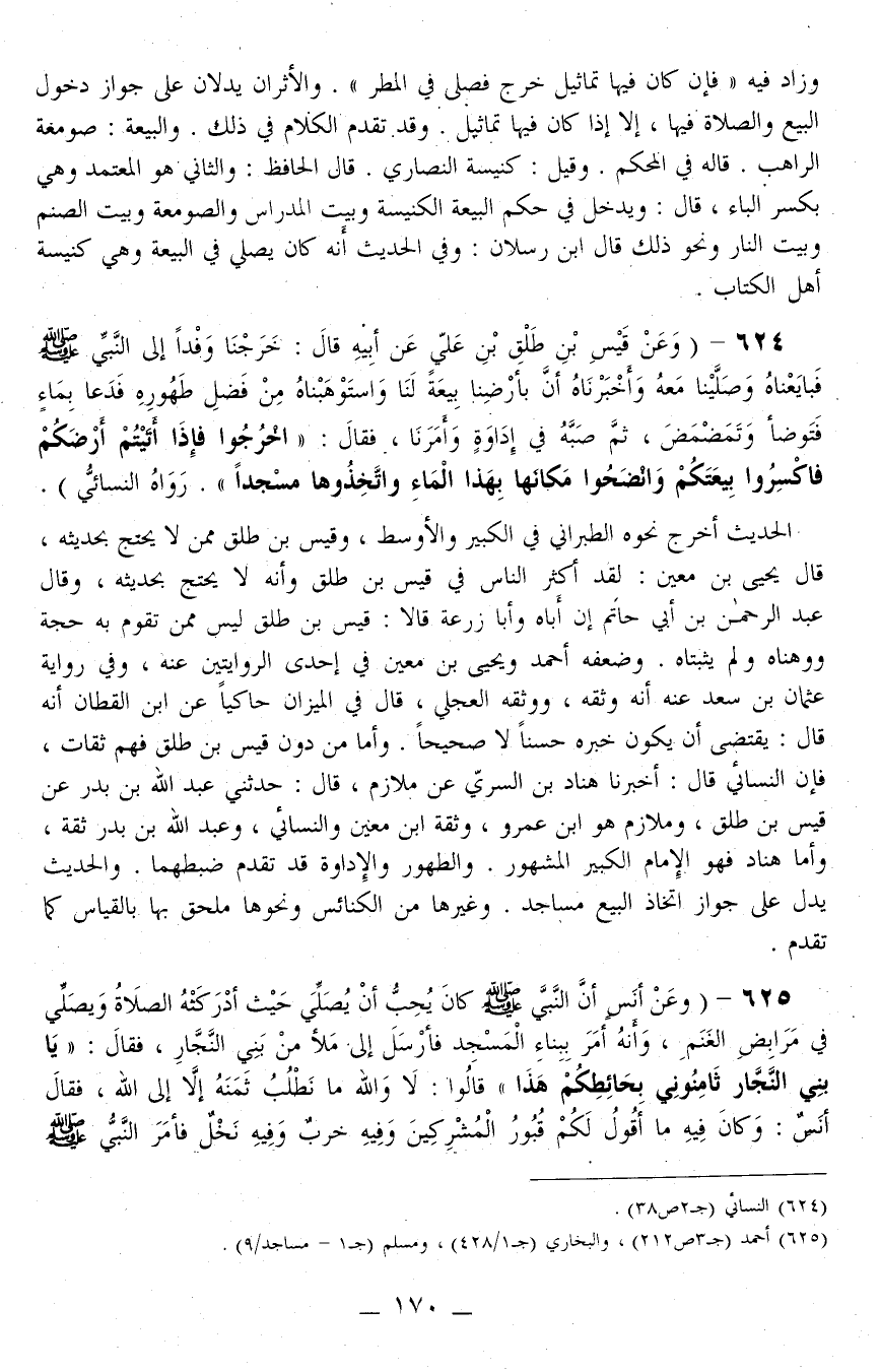 624 - (وَعَنْ قَيْسِ بْنِ طَلْقِ بْنِ عَلِيٍّ عَنْ أَبِيهِ قَالَ: «خَرَجْنَا وَفْدًا إلَى النَّبِيِّ - صَلَّى اللَّهُ عَلَيْهِ وَسَلَّمَ - فَبَايَعْنَاهُ وَصَلَّيْنَا مَعَهُ وَأَخْبَرْنَاهُ أَنَّ بِأَرْضِنَا بِيعَةٌ لَنَا وَاسْتَوْهَبْنَاهُ مِنْ فَضْلِ طَهُورِهِ فَدَعَا بِمَاءٍ فَتَوَضَّأَ وَتَمَضْمَضَ، ثُمَّ صَبَّهُ فِي إدَاوَةٍ وَأَمَرَنَا، فَقَالَ: اُخْرُجُوا فَإِذَا أَتَيْتُمْ أَرْضَكُمْ فَاكْسِرُوا بِيعَتَكُمْ وَانْضَحُوا مَكَانَهَا بِهَذَا الْمَاءِ وَاِتَّخِذُوهَا مَسْجِدًا» . رَوَاهُ النَّسَائِيّ) . الْحَدِيثُ أَخْرَجَ نَحْوَهُ الطَّبَرَانِيُّ فِي الْكَبِيرِ وَالْأَوْسَطِ، وَقَيْسُ بْنُ طَلْقٍ مِمَّنْ لَا يُحْتَجُّ بِحَدِيثِهِ، قَالَ يَحْيَى بْنُ مَعِينٍ: لَقَدْ أَكْثَرَ النَّاسُ فِي قَيْسِ بْنِ طَلْقٍ وَأَنَّهُ لَا يُحْتَجُّ بِحَدِيثِهِ، وَقَالَ عَبْدُ الرَّحْمَنِ بْنُ أَبِي حَاتِمٍ إنَّ أَبَاهُ وَأَبَا زُرْعَةَ قَالَا: قَيْسُ بْنُ طَلْقٍ لَيْسَ مِمَّنْ تَقُومُ بِهِ حُجَّةٌ وَوَهَّنَاهُ وَلَمْ يُثَبِّتَاهُ وَضَعَّفَهُ أَحْمَدُ وَيَحْيَى بْنُ مَعِينٍ فِي إحْدَى الرِّوَايَتَيْنِ عَنْهُ، وَفِي رِوَايَةِ عُثْمَانَ بْنِ سَعْدٍ عَنْهُ أَنَّهُ وَثَّقَهُ، وَوَثَّقَهُ الْعِجْلِيّ، قَالَ فِي الْمِيزَانِ حَاكِيًا عَنْ ابْنِ الْقِطَّانِ أَنَّهُ قَالَ: يَقْتَضِي أَنْ يَكُونَ خَبَرُهُ حَسَنًا لَا صَحِيحًا. وَأَمَّا مَنْ دُونَ قَيْسِ بْنِ طَلْقٍ فَهُمْ ثِقَاتٌ، فَإِنَّ النَّسَائِيّ قَالَ: أَخْبَرَنَا هَنَّادُ بْن السَّرِيِّ عَنْ مُلَازِمٍ، قَالَ: حَدَّثَنِي عَبْدُ اللَّهِ بْنِ بَدْرٍ عَنْ قَيْسِ بْنِ طَلْقٍ، وَمُلَازِمٌ هُوَ ابْنُ عَمْرِو، وَثَّقَهُ ابْنُ مَعِينٍ وَالنَّسَائِيُّ، وَعَبْدُ اللَّهِ بْنِ بَدْرٍ ثِقَةٌ، وَأَمَّا هَنَّادُ فَهُوَ الْإِمَامُ الْكَبِيرُ الْمَشْهُورُ.