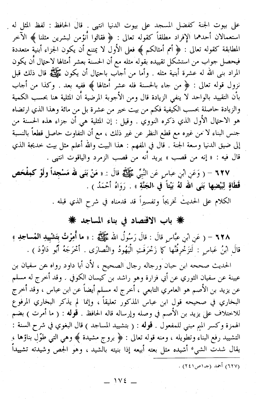 627 - (وَعَنْ ابْنِ عَبَّاسٍ عَنْ النَّبِيِّ - صَلَّى اللَّهُ عَلَيْهِ وَسَلَّمَ - قَالَ: «مَنْ بَنَى لِلَّهِ مَسْجِدًا وَلَوْ كَمَفْحَصِ قَطَاةٍ لِبَيْضِهَا بَنَى اللَّهُ لَهُ بَيْتًا فِي الْجَنَّةِ.» رَوَاهُ أَحْمَدُ) الْكَلَامُ عَلَى الْحَدِيثِ تَخْرِيجًا وَتَفْسِيرًا قَدْ قَدَّمْنَاهُ فِي شَرْحِ الَّذِي قَبْلَهُ.