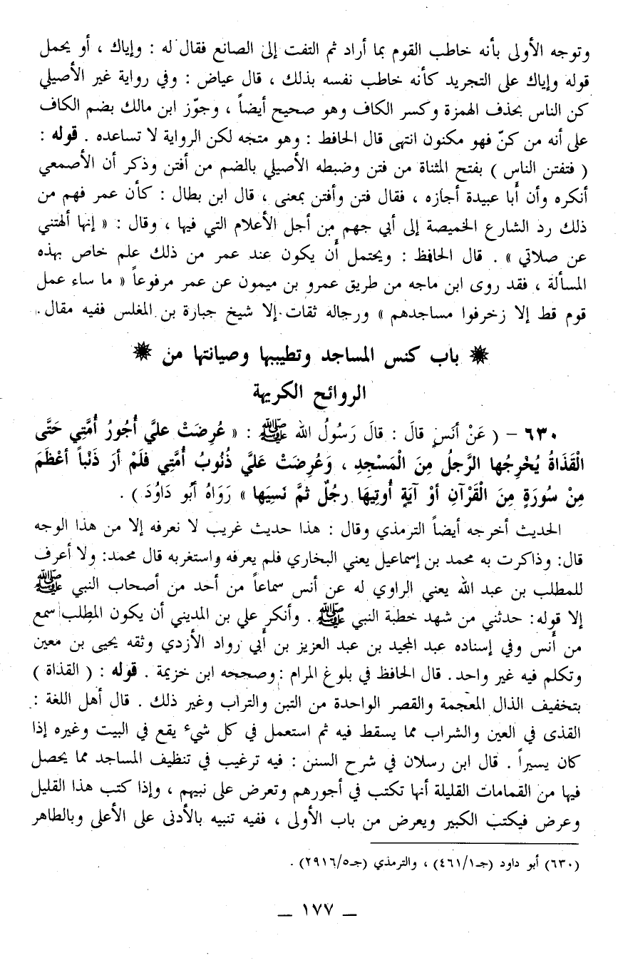 630 - (عَنْ أَنَسٍ قَالَ: قَالَ رَسُولُ اللَّهِ - صَلَّى اللَّهُ عَلَيْهِ وَسَلَّمَ -: «عُرِضَتْ عَلَيَّ أُجُورُ أُمَّتِي حَتَّى الْقَذَاةُ يُخْرِجُهَا الرَّجُلُ مِنْ الْمَسْجِدِ، وَعُرِضَتْ عَلَيَّ ذُنُوبُ أُمَّتِي فَلَمْ أَرَ ذَنْبًا أَعْظَمَ مِنْ سُورَةٍ مِنْ الْقُرْآنِ أَوْ آيَةٍ أُوتِيَهَا رَجُلٌ ثُمَّ نَسِيَهَا» رَوَاهُ أَبُو دَاوُد) .