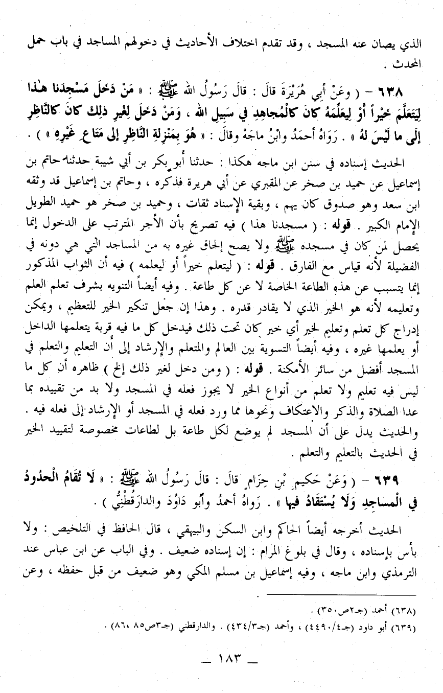 638 - وَعَنْ أَبِي هُرَيْرَةَ قَالَ: قَالَ رَسُولُ اللَّهِ - صَلَّى اللَّهُ عَلَيْهِ وَسَلَّمَ -: «مَنْ دَخَلَ مَسْجِدَنَا هَذَا لِيَتَعَلَّمَ خَيْرًا أَوْ لِيُعَلِّمَهُ كَانَ كَالْمُجَاهِدِ فِي سَبِيلِ اللَّهِ، وَمَنْ دَخَلَ لِغَيْرِ ذَلِكَ كَانَ كَالنَّاظِرِ إلَى مَا لَيْسَ لَهُ. رَوَاهُ أَحْمَدُ وَابْنُ مَاجَهْ وَقَالَ: هُوَ بِمَنْزِلَةِ النَّاظِرِ إلَى مَتَاعِ غَيْرِهِ» .