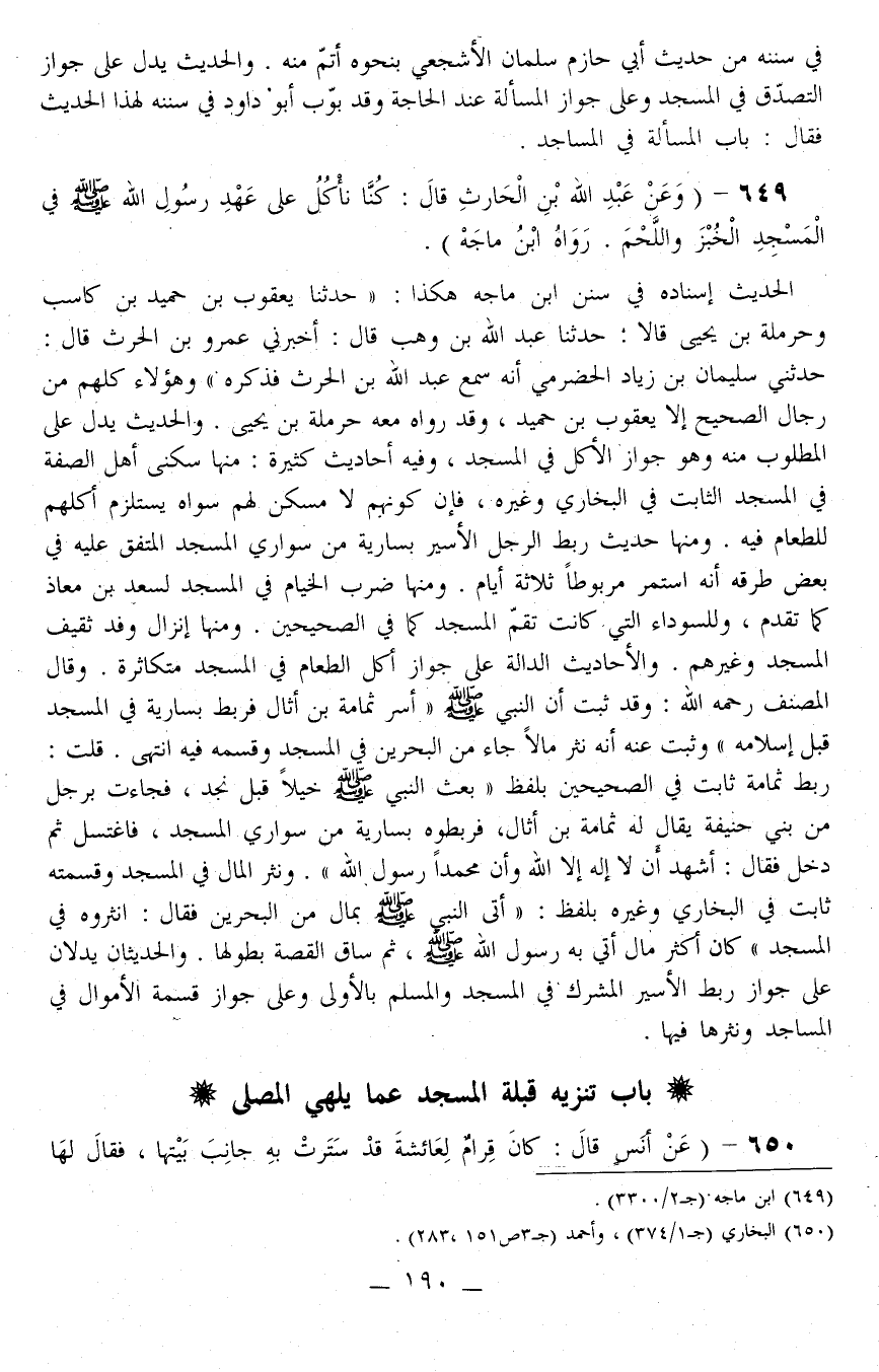 الْحَدِيثُ إسْنَادُهُ فِي سُنَنِ ابْنِ مَاجَهْ هَكَذَا: " حَدَّثَنَا يَعْقُوبُ بْنُ حُمَيْدٍ بْنِ كَاسِبٍ وَحَرْمَلَةُ بْنُ يَحْيَى قَالَا: حَدَّثَنَا عَبْدُ اللَّهِ بْنُ وَهْبٍ قَالَ: أَخْبَرَنِي عَمْرُو بْنُ الْحَارِثِ قَالَ: حَدَّثَنِي سُلَيْمَانُ بْنُ زِيَادٍ الْحَضْرَمِيُّ أَنَّهُ سَمِعَ عَبْدَ اللَّهِ بْنَ الْحَارِثِ فَذَكَرَهُ " وَهَؤُلَاءِ كُلُّهُمْ مِنْ رِجَالِ الصَّحِيحِ إلَّا يَعْقُوبَ بْنَ حُمَيْدٍ، وَقَدْ رَوَاهُ مَعَهُ حَرْمَلَةُ بْنُ يَحْيَى. وَالْحَدِيثُ يَدُلُّ عَلَى الْمَطْلُوبِ مِنْهُ وَهُوَ جَوَازُ الْأَكْلِ فِي الْمَسْجِدِ، وَفِيهِ أَحَادِيثُ كَثِيرَةٌ: مِنْهَا سُكْنَى أَهْلِ الصُّفَّةِ فِي الْمَسْجِدِ الثَّابِتُ فِي الْبُخَارِيِّ وَغَيْرِهِ، فَإِنَّ كَوْنَهُمْ لَا مَسْكَنَ لَهُمْ سِوَاهُ يَسْتَلْزِمُ أَكْلَهُمْ لِلطَّعَامِ فِيهِ. وَمِنْهَا حَدِيثُ رَبْطِ الرَّجُلِ الْأَسِيرِ بِسَارِيَةٍ مِنْ سَوَارِي الْمَسْجِدِ الْمُتَّفَقُ عَلَيْهِ فِي بَعْضِ طُرُقِهِ أَنَّهُ اسْتَمَرَّ مَرْبُوطًا ثَلَاثَةَ أَيَّامٍ. وَمِنْهَا ضَرْبُ الْخِيَامِ فِي الْمَسْجِدِ لِسَعْدِ بْنِ مُعَاذٍ كَمَا تَقَدَّمَ، وَلِلسَّوْدَاءِ الَّتِي كَانَتْ تَقُمُّ الْمَسْجِدَ كَمَا فِي الصَّحِيحَيْنِ. وَمِنْهَا إنْزَالُ وَفْدِ ثَقِيفٍ الْمَسْجِدَ وَغَيْرِهِمْ. وَالْأَحَادِيثُ الدَّالَّةُ عَلَى جَوَازِ أَكْلِ الطَّعَامِ فِي الْمَسْجِدِ مُتَكَاثِرَةٌ. وَقَالَ الْمُصَنِّفُ - رَحِمَهُ اللَّهُ -: وَقَدْ ثَبَتَ «أَنَّ النَّبِيَّ - صَلَّى اللَّهُ عَلَيْهِ وَسَلَّمَ - أَسَرَ ثُمَامَةَ بْنَ أَثَالٍ فَرُبِطَ بِسَارِيَةٍ فِي الْمَسْجِدِ قَبْلَ إسْلَامِهِ» وَثَبَتَ عَنْهُ أَنَّهُ نَثَرَ مَالًا جَاءَ مِنْ الْبَحْرَيْنِ فِي الْمَسْجِدِ وَقَسَمَهُ فِيهِ انْتَهَى. قُلْت: رَبْطُ ثُمَامَةَ ثَابِتٌ فِي الصَّحِيحَيْنِ بِلَفْظِ «بَعَثَ النَّبِيُّ - صَلَّى اللَّهُ عَلَيْهِ وَسَلَّمَ - خَيْلًا قِبَلَ نَجْدٍ، فَجَاءَتْ بِرَجُلٍ مِنْ بَنِي حَنِيفَةَ يُقَالُ لَهُ ثُمَامَةُ بْنُ أَثَالٍ، فَرَبَطُوهُ بِسَارِيَةٍ مِنْ سَوَارِي الْمَسْجِدِ، فَاغْتَسَلَ ثُمَّ دَخَلَ فَقَالَ: أَشْهَدُ أَنْ لَا إلَه إلَّا اللَّهُ وَأَنَّ مُحَمَّدًا رَسُولُ اللَّهِ» .