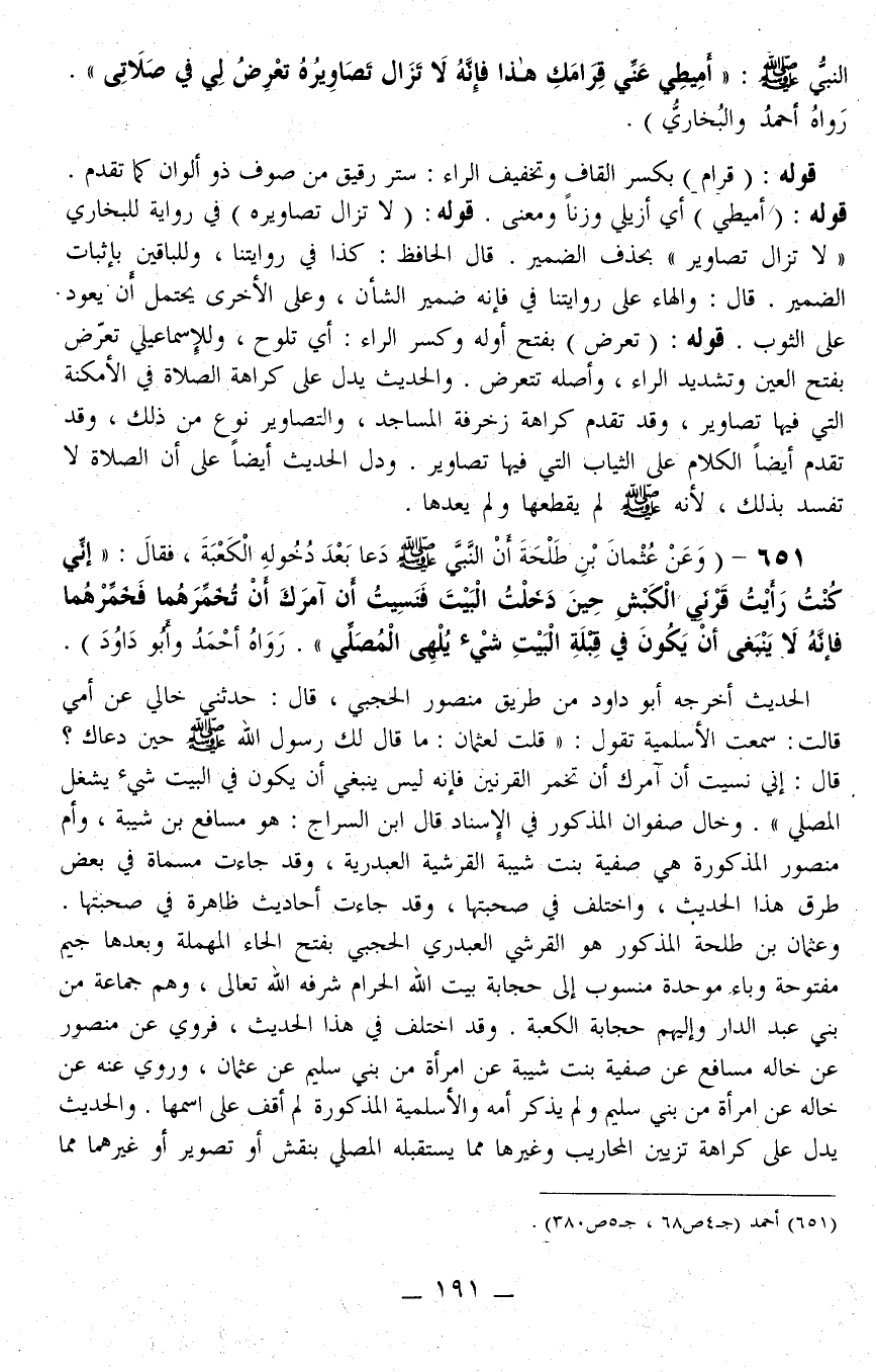 651 - (وَعَنْ عُثْمَانَ بْنِ طَلْحَةَ «أَنَّ النَّبِيَّ - صَلَّى اللَّهُ عَلَيْهِ وَسَلَّمَ - دَعَا بَعْدَ دُخُولِهِ الْكَعْبَةَ، فَقَالَ: إنِّي كُنْت رَأَيْت قَرْنَيْ الْكَبْشِ حِينَ دَخَلْت الْبَيْتَ فَنَسِيت أَنْ آمُرَك أَنْ تُخَمِّرَهُمَا فَخَمِّرْهُمَا فَإِنَّهُ لَا يَنْبَغِي أَنْ يَكُونَ فِي قِبْلَةِ الْبَيْتِ شَيْءٌ يُلْهِي الْمُصَلِّي» . رَوَاهُ أَحْمَدُ وَأَبُو دَاوُد) . الْحَدِيثُ أَخْرَجَهُ أَبُو دَاوُد مِنْ طَرِيقِ مَنْصُورٍ الْحَجَبِيِّ، قَالَ: حَدَّثَنِي خَالِي عَنْ أُمِّي قَالَتْ: سَمِعْت «الْأَسْلَمِيَّةَ تَقُولُ: قُلْت لِعُثْمَانَ: مَا قَالَ لَك رَسُولُ اللَّهِ - صَلَّى اللَّهُ عَلَيْهِ وَسَلَّمَ - حِينَ دَعَاك؟ قَالَ: إنِّي نَسِيت أَنْ آمُرَك أَنْ تُخَمِّرَ الْقَرْنَيْنِ فَإِنَّهُ لَيْسَ يَنْبَغِي أَنْ يَكُونَ فِي الْبَيْتِ شَيْءٌ يَشْغَلُ الْمُصَلِّيَ»