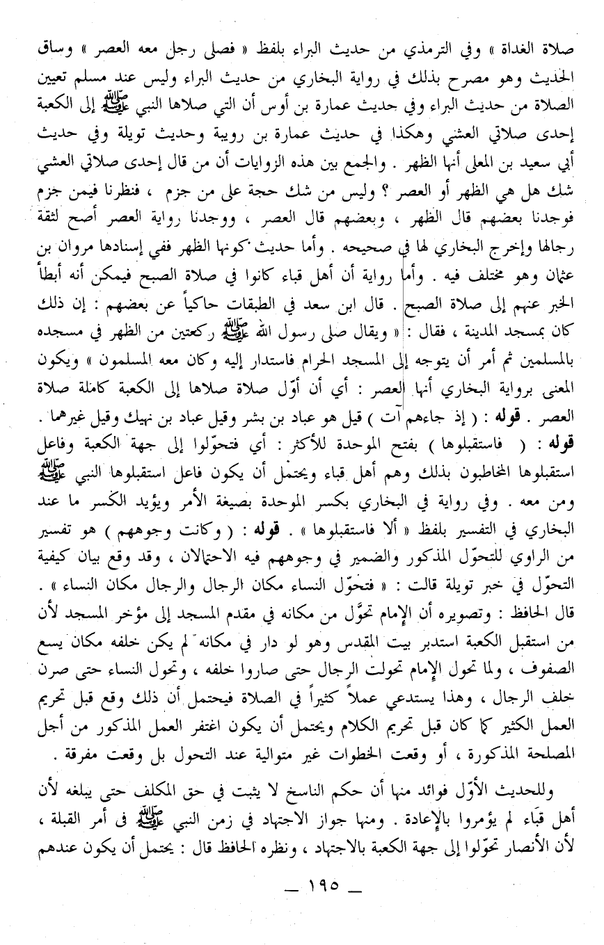 ـــــــــــــــــــــــــــــQصَلَاةَ الْغَدَاةِ» وَفِي التِّرْمِذِيِّ مِنْ حَدِيثِ الْبَرَاءِ بِلَفْظِ «فَصَلَّى رَجُلٌ مَعَهُ الْعَصْرَ» وَسَاقَ الْحَدِيثَ وَهُوَ مُصَرِّحٌ بِذَلِكَ فِي رِوَايَةِ الْبُخَارِيِّ مِنْ حَدِيثِ الْبَرَاءِ وَلَيْسَ عِنْدَ مُسْلِمٍ تَعْيِينُ الصَّلَاةِ مِنْ حَدِيثِ الْبَرَاءِ وَفِي حَدِيثِ عُمَارَةَ بْنِ أَوْسٍ أَنَّ الَّتِي صَلَّاهَا النَّبِيُّ - صَلَّى اللَّهُ عَلَيْهِ وَسَلَّمَ - إلَى الْكَعْبَةِ إحْدَى صَلَاتَيْ الْعَشِيِّ وَهَكَذَا فِي حَدِيثِ عُمَارَةَ بْن رُوَيْبَةَ وَحَدِيثِ تَوِيلَةَ وَفِي حَدِيثِ أَبِي سَعِيدِ بْنِ الْمُعَلَّى أَنَّهَا الظُّهْرُ. وَالْجَمْعُ بَيْنَ هَذِهِ الرِّوَايَاتِ أَنَّ مَنْ قَالَ إحْدَى صَلَاتَيْ الْعَشِيِّ شَكَّ هَلْ هِيَ الظُّهْرُ أَوْ الْعَصْرُ؟ وَلَيْسَ مَنْ شَكَّ حُجَّةً عَلَى مَنْ جَزَمَ، فَنَظَرْنَا فِيمَنْ جَزَمَ فَوَجَدْنَا بَعْضَهُمْ قَالَ الظُّهْرُ، وَبَعْضَهُمْ قَالَ الْعَصْرُ، وَوَجَدْنَا رِوَايَةَ الْعَصْرِ أَصَحَّ لِثِقَةِ رِجَالِهَا وَأَخْرَجَ الْبُخَارِيُّ لَهَا فِي صَحِيحِهِ. وَأَمَّا حَدِيثُ كَوْنِهَا الظُّهْرَ فَفِي إسْنَادِهَا مَرْوَانُ بْنُ عُثْمَانَ وَهُوَ مُخْتَلَفٌ فِيهِ وَأَمَّا رِوَايَةُ أَنَّ أَهْلَ قُبَاءَ كَانُوا فِي صَلَاةِ الصُّبْحِ فَيُمْكِنُ أَنَّهُ أَبْطَأَ الْخَبَرَ عَنْهُمْ إلَى صَلَاةِ الصُّبْحِ. قَالَ ابْنُ سَعْدٍ فِي الطَّبَقَاتِ حَاكِيًا عَنْ بَعْضِهِمْ: إنَّ ذَلِكَ كَانَ بِمَسْجِدِ الْمَدِينَةِ، فَقَالَ: وَيُقَالُ «صَلَّى رَسُولُ اللَّهِ - صَلَّى اللَّهُ عَلَيْهِ وَسَلَّمَ - رَكْعَتَيْنِ مِنْ الظُّهْرِ فِي مَسْجِدِهِ بِالْمُسْلِمِينَ ثُمَّ أُمِرَ أَنْ يَتَوَجَّهَ إلَى الْمَسْجِدِ الْحَرَامِ فَاسْتَدَارَ إلَيْهِ وَكَانَ مَعَهُ الْمُسْلِمُونَ» وَيَكُونُ الْمَعْنَى بِرِوَايَةِ الْبُخَارِيِّ أَنَّهَا الْعَصْرُ: أَيْ أَنَّ أَوَّلَ صَلَاةٍ صَلَّاهَا إلَى الْكَعْبَةِ كَامِلَةً صَلَاةُ الْعَصْرِ.