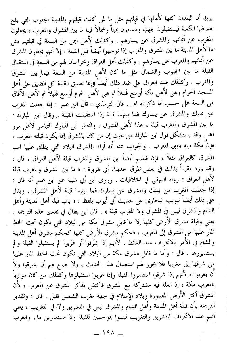 وَرَوَى ابْنُ أَبِي شَيْبَةَ عَنْ ابْنِ عُمَرَ أَنَّهُ قَالَ: إذَا جَعَلْت الْمَغْرِبَ مِنْ يَمِينِك وَالْمَشْرِقَ عَنْ يَسَارِك فَمَا بَيْنَهُمَا قِبْلَةٌ لِأَهْلِ الْمَشْرِقِ وَيَدُلُّ عَلَى ذَلِكَ أَيْضًا تَبْوِيبُ الْبُخَارِيِّ عَلَى حَدِيثِ أَبِي أَيُّوبَ بِلَفْظِ: بَابُ قِبْلَةِ أَهْلِ الْمَدِينَةِ وَأَهْلِ الشَّامِ وَالْمَشْرِقُ لَيْسَ فِي الْمَشْرِقِ وَلَا الْمَغْرِبُ قِبْلَةٌ قَالَ ابْنُ بَطَّالٍ فِي تَفْسِيرِ هَذِهِ التَّرْجَمَةِ: يَعْنِي وَقِبْلَةُ مَشْرِقِ الْأَرْضِ كُلِّهَا إلَّا مَا قَابَلَ مَشْرِقَ مَكَّةَ مِنْ الْبِلَادِ الَّتِي تَكُونُ تَحْتَ الْخَطِّ الْمَارِّ عَلَيْهَا مِنْ الْمَشْرِقِ إلَى الْمَغْرِبِ، فَحُكْمُ مَشْرِقِ الْأَرْضِ كُلِّهَا كَحُكْمِ مَشْرِقِ أَهْلِ الْمَدِينَةِ وَالشَّامِ فِي الْأَمْرِ بِالِانْحِرَافِ عِنْدَ الْغَائِطِ، لِأَنَّهُمْ إذَا شَرَّقُوا أَوْ غَرَّبُوا لَمْ يَسْتَقْبِلُوا الْقِبْلَةَ وَلَمْ يَسْتَدْبِرُوهَا. قَالَ: وَأَمَّا مَا قَابَلَ مَشْرِقَ مَكَّةَ مِنْ الْبِلَادِ الَّتِي تَكُونُ تَحْتِ الْخَطِّ الْمَارِّ عَلَيْهَا مِنْ شَرْقِهَا إلَى مَغْرِبِهَا فَلَا يَجُوزُ لَهُمْ اسْتِعْمَالُ هَذَا الْحَدِيثِ، وَلَا يَصِحُّ لَهُمْ أَنْ يُشَرِّقُوا وَلَا أَنْ يُغَرِّبُوا، لِأَنَّهُمْ إذَا شَرَّقُوا اسْتَدْبَرُوا الْقِبْلَةَ وَاذَا غَرَّبُوا اسْتَقْبَلُوهَا وَكَذَلِكَ مَنْ كَانَ مُوَازِيًا بِالْمَغْرِبِ مَكَّةَ، إذْ الْعِلَّةُ فِيهِ مُشْتَرَكَةٌ مَعَ الْمَشْرِقِ فَاكْتَفَى بِذِكْرِ الْمَشْرِقِ عَنْ الْمَغْرِبِ، لِأَنَّ الْمَشْرِقَ أَكْثَرُ الْأَرْضِ الْمَعْمُورَةِ وَبِلَادُ الْإِسْلَامِ فِي جِهَةِ مَغْرِبِ الشَّمْسِ قَلِيلٌ.