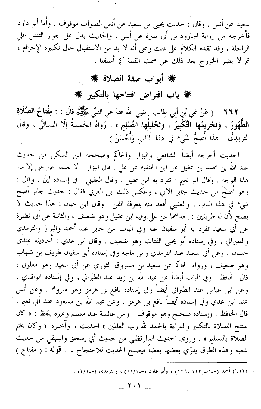 662 - (عَنْ عَلِيِّ بْنِ أَبِي طَالِبٍ - رَضِيَ اللَّهُ عَنْهُ - عَنْ النَّبِيِّ - صَلَّى اللَّهُ عَلَيْهِ وَسَلَّمَ - قَالَ: «مِفْتَاحُ الصَّلَاةِ الطَّهُورُ، وَتَحْرِيمُهَا التَّكْبِيرُ، وَتَحْلِيلُهَا التَّسْلِيمُ» : رَوَاهُ الْخَمْسَةُ إلَّا النَّسَائِيّ، وَقَالَ التِّرْمِذِيُّ: هَذَا أَصَحُّ شَيْءٍ فِي هَذَا الْبَابِ وَأَحْسَنُ) .