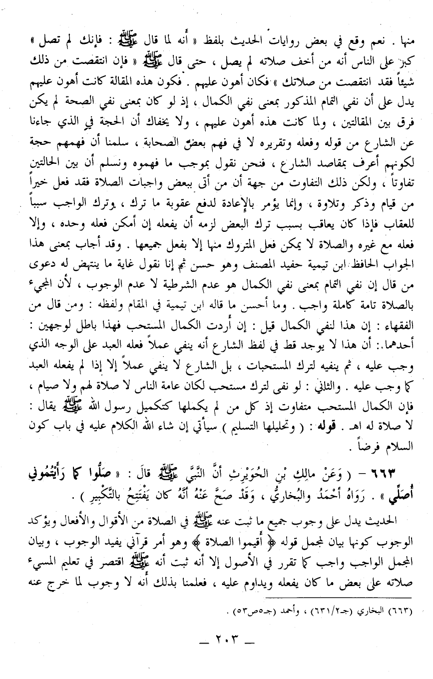 وَمَا أَحْسَنَ مَا قَالَهُ ابْنُ تَيْمِيَّةَ فِي الْمَقَامِ وَلَفْظُهُ: وَمَنْ قَالَ مِنْ الْفُقَهَاءِ: إنَّ هَذَا لِنَفْيِ الْكَمَالِ قِيلَ: إنْ أَرَدْت الْكَمَالَ الْمُسْتَحَبَّ فَهَذَا بَاطِلٌ لِوَجْهَيْنِ: أَحَدُهُمَا: أَنَّ هَذَا لَا يُوجَدُ قَطُّ فِي لَفْظِ الشَّارِعِ أَنَّهُ يَنْفِي عَمَلًا فَعَلَهُ الْعَبْدُ عَلَى الْوَجْهِ الَّذِي وَجَبَ عَلَيْهِ، ثُمَّ يَنْفِيه لِتَرْكِ الْمُسْتَحَبَّاتِ، بَلْ الشَّارِعُ لَا يَنْفِي عَمَلًا إلَّا إذَا لَمْ يَفْعَلْهُ الْعَبْدُ كَمَا وَجَبَ عَلَيْهِ. وَالثَّانِي: لَوْ نُفِيَ لِتَرْكِ مُسْتَحَبٍّ لَكَانَ عَامَّةُ النَّاسِ لَا صَلَاةَ لَهُمْ وَلَا صُيَّامَ، فَإِنَّ الْكَمَالَ الْمُسْتَحَبَّ مُتَفَاوِتٌ إذْ كُلُّ مَنْ لَمْ يُكْمِلْهَا كَتَكْمِيلِ رَسُولِ اللَّهِ - صَلَّى اللَّهُ عَلَيْهِ وَسَلَّمَ - يُقَالُ: لَا صَلَاةَ لَهُ اهـ.