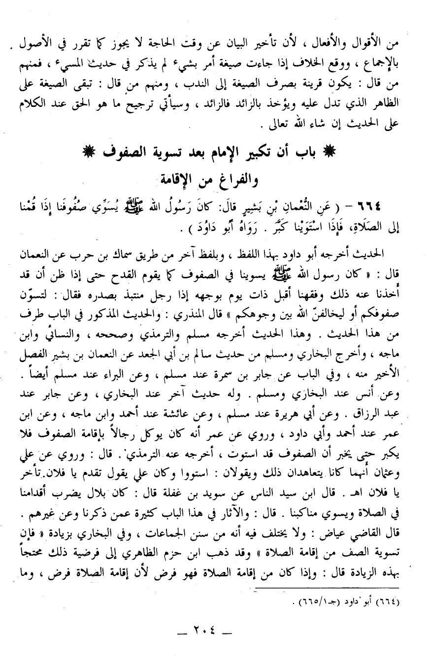 664 - (عَنْ النُّعْمَانِ بْنِ بَشِيرٍ قَالَ: «كَانَ رَسُولُ اللَّهِ - صَلَّى اللَّهُ عَلَيْهِ وَسَلَّمَ - يُسَوِّي صُفُوفَنَا إذَا قُمْنَا إلَى الصَّلَاةِ، فَإِذَا اسْتَوَيْنَا كَبَّرَ» . رَوَاهُ أَبُو دَاوُد) .