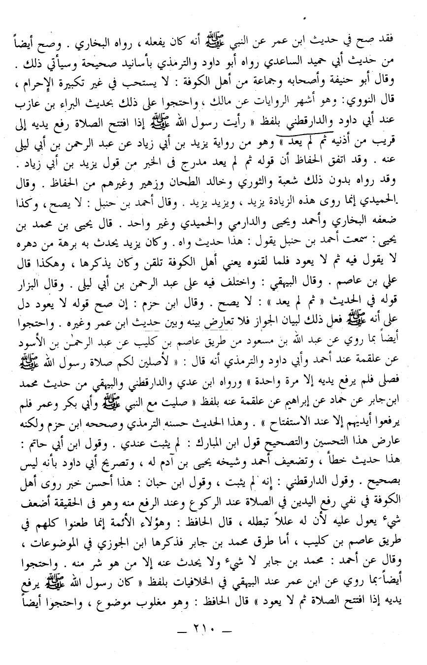 ـــــــــــــــــــــــــــــQفَقَدْ صَحَّ فِي حَدِيثِ ابْنِ عُمَرَ عَنْ النَّبِيِّ - صَلَّى اللَّهُ عَلَيْهِ وَسَلَّمَ - أَنَّهُ كَانَ يَفْعَلُهُ، رَوَاهُ الْبُخَارِيُّ. وَصَحَّ أَيْضًا مِنْ حَدِيثِ أَبِي حُمَيْدٍ السَّاعِدِيِّ رَوَاهُ أَبُو دَاوُد وَالتِّرْمِذِيُّ بِأَسَانِيدَ صَحِيحَةٍ وَسَيَأْتِي ذَلِكَ. وَقَالَ أَبُو حَنِيفَةَ وَأَصْحَابُهُ وَجَمَاعَةٌ مِنْ أَهْلِ الْكُوفَةِ: لَا يُسْتَحَبُّ فِي غَيْرِ تَكْبِيرَةِ الْإِحْرَامِ، قَالَ النَّوَوِيُّ: وَهُوَ أَشْهَرُ الرِّوَايَاتِ عَنْ مَالِكٍ، وَاحْتَجُّوا عَلَى ذَلِكَ بِحَدِيثِ الْبَرَاءِ بْنِ عَازِبٍ عِنْدَ أَبِي دَاوُد وَالدَّارَقُطْنِيّ بِلَفْظِ رَأَيْت رَسُولَ اللَّهِ - صَلَّى اللَّهُ عَلَيْهِ وَسَلَّمَ - «إذَا افْتَتَحَ الصَّلَاةَ رَفَعَ يَدَيْهِ إلَى قَرِيبٍ مِنْ أُذُنَيْهِ ثُمَّ لَمْ يَعُدْ» وَهُوَ مِنْ رِوَايَةِ يَزِيدَ بْنِ أَبِي زِيَادٍ عَنْ عَبْدِ الرَّحْمَنِ بْنِ أَبِي لَيْلَى عَنْهُ وَقَدْ اتَّفَقَ الْحُفَّاظُ أَنَّ قَوْلَهُ ثُمَّ لَمْ يَعُدْ مُدْرَجٌ فِي الْخَبَرِ مِنْ قَوْلِ يَزِيدَ بْنِ أَبِي زِيَادٍ. وَقَدْ رَوَاهُ بِدُونِ ذَلِكَ شُعْبَةُ وَالثَّوْرِيُّ وَخَالِدٌ الطَّحَّانُ وَزُهَيْرٌ وَغَيْرُهُمْ مِنْ الْحُفَّاظِ. وَقَالَ الْحُمَيْدِيُّ إنَّمَا رَوَى هَذِهِ الزِّيَادَةَ يَزِيدُ، وَيَزِيدُ يَزِيدُ. وَقَالَ أَحْمَدُ بْنُ حَنْبَلٍ: لَا يَصِحُّ، وَكَذَا ضَعَّفَهُ الْبُخَارِيُّ وَأَحْمَدُ وَيَحْيَى وَالدَّارِمِيُّ وَالْحُمَيْدِيُّ وَغَيْرُ وَاحِدٍ. قَالَ يَحْيَى بْنُ مُحَمَّدِ بْنِ يَحْيَى: سَمِعْت أَحْمَدَ بْنَ حَنْبَلٍ يَقُولُ: هَذَا حَدِيثٌ وَاهٍ. وَكَانَ يَزِيدُ يُحَدِّثُ بِهِ بُرْهَةً مِنْ دَهْرِهِ لَا يَقُولُ فِيهِ ثُمَّ لَا يَعُودُ فَلَمَّا لَقَّنُوهُ يَعْنِي أَهْلَ الْكُوفَةِ تَلَقَّنَ وَكَانَ يَذْكُرُهَا، وَهَكَذَا قَالَ عَلِيُّ بْنُ عَاصِمٍ. وَقَالَ الْبَيْهَقِيُّ: وَاخْتُلِفَ فِيهِ عَلَى عَبْدِ الرَّحْمَنِ بْنِ أَبِي لَيْلَى. وَقَالَ الْبَزَّارُ قَوْلُهُ فِي الْحَدِيثِ " ثُمَّ لَمْ يَعُدْ ": لَا يَصِحُّ.