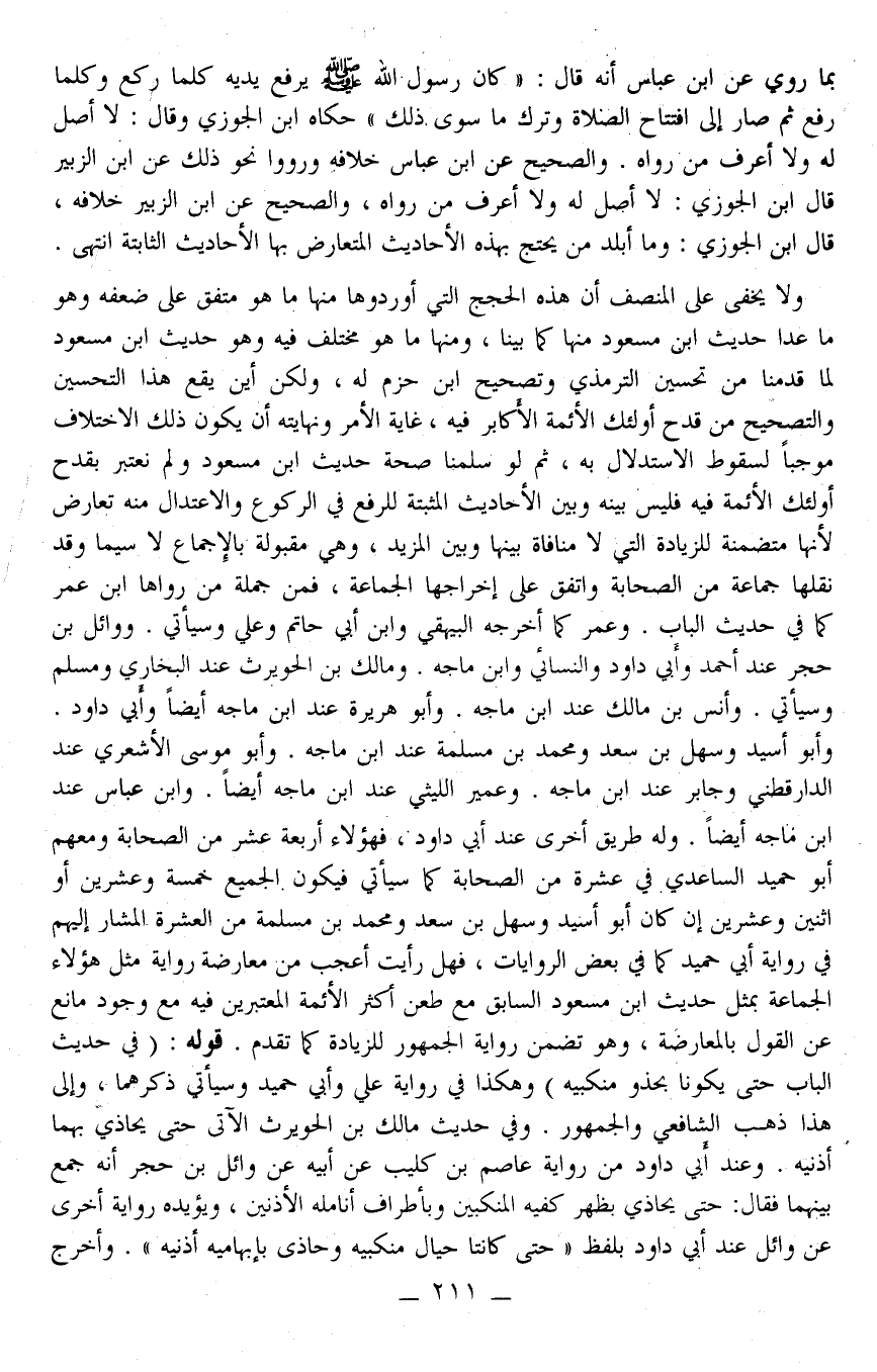ـــــــــــــــــــــــــــــQبِمَا رُوِيَ عَنْ ابْنِ عَبَّاسٍ أَنَّهُ قَالَ: «كَانَ رَسُولُ اللَّهِ - صَلَّى اللَّهُ عَلَيْهِ وَسَلَّمَ - يَرْفَعُ يَدَيْهِ كُلَّمَا رَكَعَ وَكُلَّمَا رَفَعَ ثُمَّ صَارَ إلَى افْتِتَاحِ الصَّلَاةِ وَتَرَكَ مَا سِوَى ذَلِكَ» حَكَاهُ ابْنُ الْجَوْزِيِّ وَقَالَ: لَا أَصْلَ لَهُ وَلَا أَعْرِفُ مَنْ رَوَاهُ وَالصَّحِيحُ عَنْ ابْنِ عَبَّاسٍ خِلَافُهُ وَرَوَوْا نَحْوَ ذَلِكَ عَنْ ابْنِ الزُّبَيْرِ قَالَ ابْنُ الْجَوْزِيِّ: لَا أَصْلَ لَهُ وَلَا أَعْرِفُ مَنْ رَوَاهُ، وَالصَّحِيحُ عَنْ ابْنِ الزُّبَيْرِ خِلَافُهُ، قَالَ ابْنُ الْجَوْزِيِّ: وَمَا أَبْلَدَ مَنْ يَحْتَجُّ بِهَذِهِ الْأَحَادِيثِ الْمُتَعَارَضِ بِهَا الْأَحَادِيثُ الثَّابِتَةُ انْتَهَى. وَلَا يَخْفَى عَلَى الْمُنْصِفِ أَنَّ هَذِهِ الْحُجَجَ الَّتِي أَوْرَدُوهَا مِنْهَا مَا هُوَ مُتَّفَقٌ عَلَى ضَعْفِهِ وَهُوَ مَا عَدَا حَدِيثَ ابْنِ مَسْعُودٍ مِنْهَا كَمَا بَيَّنَّا، وَمِنْهَا مَا هُوَ مُخْتَلَفٌ فِيهِ وَهُوَ حَدِيثُ ابْنِ مَسْعُودٍ لِمَا قَدَّمْنَا مِنْ تَحْسِينِ التِّرْمِذِيِّ وَتَصْحِيحِ ابْنِ حَزْمٍ لَهُ، وَلَكِنْ أَيْنَ يَقَعُ هَذَا التَّحْسِينُ وَالتَّصْحِيحُ مِنْ قَدْحِ أُولَئِكَ الْأَئِمَّةِ الْأَكَابِرِ فِيهِ، غَايَةُ الْأَمْرِ وَنِهَايَتُهُ أَنْ يَكُونَ ذَلِكَ الِاخْتِلَافُ مُوجِبًا لِسُقُوطِ الِاسْتِدْلَالِ بِهِ، ثُمَّ لَوْ سَلَّمْنَا صِحَّةَ حَدِيثِ ابْنِ مَسْعُودٍ وَلَمْ نَعْتَبِرْ بِقَدَحِ أُولَئِكَ الْأَئِمَّةِ فِيهِ فَلَيْسَ بَيْنَهُ وَبَيْنَ الْأَحَادِيثِ الْمُثْبِتَةِ لِلرَّفْعِ فِي الرُّكُوعِ وَالِاعْتِدَالِ مِنْهُ تَعَارُضٌ لِأَنَّهَا مُتَضَمِّنَةٌ لِلزِّيَادَةِ الَّتِي لَا مُنَافَاةَ بَيْنَهَا وَبَيْنَ الْمَزِيدِ، وَهِيَ مَقْبُولَةٌ بِالْإِجْمَاعِ لَا سِيَّمَا وَقَدْ نَقَلَهَا جَمَاعَةٌ مِنْ الصَّحَابَةِ وَاتَّفَقَ عَلَى إخْرَاجِهَا الْجَمَاعَةُ، فَمِنْ جُمْلَةِ مَنْ رَوَاهَا ابْنُ عُمَرَ كَمَا فِي حَدِيثِ الْبَابِ. وَعُمَرُ كَمَا أَخْرَجَهُ الْبَيْهَقِيُّ وَابْنُ أَبِي حَاتِمٍ وَعَلِيٌّ وَسَيَأْتِي وَوَائِلُ بْنُ حُجْرٍ عِنْدَ أَحْمَدَ وَأَبِي دَاوُد وَالنَّسَائِيُّ وَابْنِ مَاجَهْ وَمَالِكُ بْنُ الْحُوَيْرِثِ عِنْدَ الْبُخَارِيِّ وَمُسْلِمٍ وَسَيَأْتِي. وَأَنَسُ بْنُ مَالِكٍ عِنْدَ ابْنِ مَاجَهْ. وَأَبُو هُرَيْرَةَ عِنْدَ ابْنِ مَاجَهْ أَيْضًا وَأَبِي دَاوُد. وَأَبُو أَسِيد وَسَهْلُ بْنُ سَعْدٍ وَمُحَمَّدُ بْنُ مُسْلِمَةَ عِنْدَ ابْنِ مَاجَهْ. وَأَبُو مُوسَى الْأَشْعَرِيُّ عِنْدَ الدَّارَقُطْنِيّ وَجَابِرٌ عِنْدَ ابْنِ مَاجَهْ. وَعُمَيْرٌ اللَّيْثِيُّ عِنْد ابْنِ مَاجَهْ أَيْضًا. وَابْنِ عَبَّاس عِنْد ابْنِ مَاجَهْ أَيْضًا. وَلَهُ طَرِيق أُخْرَى عِنْد أَبِي دَاوُد، فَهَؤُلَاءِ أَرْبَعَةَ عَشَرَ مِنْ الصَّحَابَة وَمَعَهُمْ أَبُو حُمَيْدٍ السَّاعِدِيُّ فِي عَشَرَة مِنْ الصَّحَابَة كَمَا سَيَأْتِي فَيَكُونُ الْجَمِيع خَمْسَة وَعِشْرِينَ أَوْ اثْنَيْنِ وَعِشْرِينَ إنْ كَانَ أَبُو أَسِيد وَسَهْلُ بْنُ سَعْدٍ وَمُحَمَّدُ بْنُ مَسْلَمَةُ مِنْ الْعَشَرَةِ الْمُشَارِ إلَيْهِمْ فِي رِوَايَةِ أَبِي حُمَيْدٍ كَمَا فِي بَعْضِ الرِّوَايَاتِ، فَهَلْ رَأَيْت أَعْجَبَ مِنْ مُعَارَضَةِ رِوَايَةِ مِثْلِ هَؤُلَاءِ الْجَمَاعَةِ بِمِثْلِ حَدِيثِ ابْنِ مَسْعُودٍ السَّابِقِ مَعَ طَعْنِ أَكْثَرِ الْأَئِمَّةِ الْمُعْتَبَرِينَ فِيهِ مَعَ وُجُودِ مَانِعٍ عَنْ الْقَوْلِ بِالْمُعَارَضَةِ، وَهُوَ تَضَمُّنُ رِوَايَةِ الْجُمْهُورِ لِلزِّيَادَةِ كَمَا تَقَدَّمَ