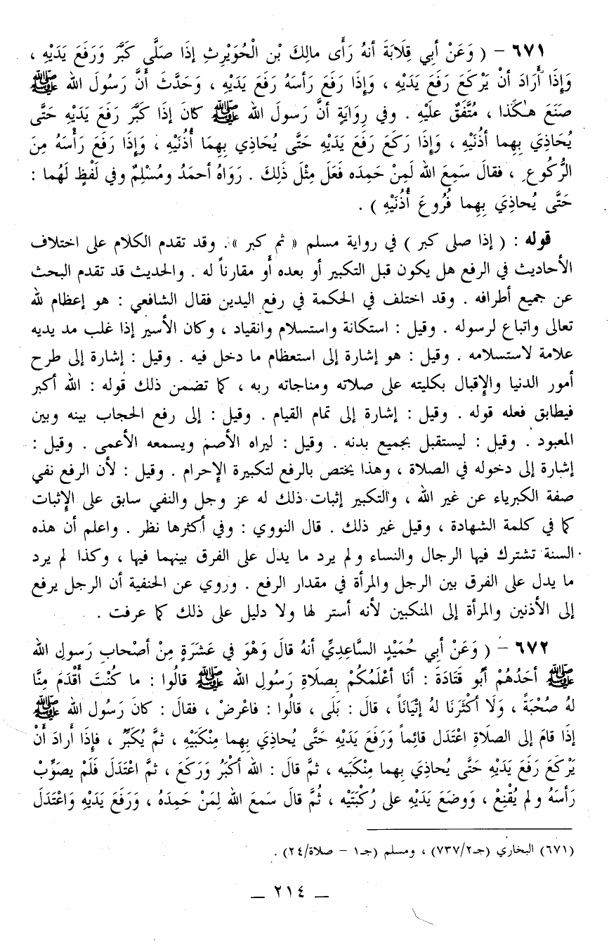 672 - (وَعَنْ أَبِي حُمَيْدٍ السَّاعِدِيِّ «أَنَّهُ قَالَ وَهُوَ فِي عَشَرَةٍ مِنْ أَصْحَابِ رَسُولِ اللَّهِ - صَلَّى اللَّهُ عَلَيْهِ وَسَلَّمَ - أَحَدُهُمْ أَبُو قَتَادَةَ: أَنَا أَعْلَمُكُمْ بِصَلَاةِ رَسُولِ اللَّهِ - صَلَّى اللَّهُ عَلَيْهِ وَسَلَّمَ - قَالُوا: مَا كُنْت أَقْدَمَ لَهُ صُحْبَةً، وَلَا أَكْثَرَنَا لَهُ إتْيَانًا، قَالَ: بَلَى، قَالُوا: فَاعْرِضْ، فَقَالَ: كَانَ رَسُولُ اللَّهِ - صَلَّى اللَّهُ عَلَيْهِ وَسَلَّمَ - إذَا قَامَ إلَى الصَّلَاةِ اعْتَدَلَ قَائِمًا وَرَفَعَ يَدَيْهِ حَتَّى يُحَاذِيَ بِهِمَا مَنْكِبَيْهِ، ثُمَّ يُكَبِّرُ، فَإِذَا أَرَادَ أَنْ يَرْكَعَ رَفَعَ يَدَيْهِ حَتَّى يُحَاذِيَ بِهِمَا مَنْكِبَيْهِ، ثُمَّ قَالَ: اللَّهُ أَكْبَرُ وَرَكَعَ، ثُمَّ اعْتَدَلَ فَلَمْ يُصَوِّبْ رَأْسَهُ وَلَمْ يُقْنِعْ، وَوَضَعَ يَدَيْهِ عَلَى رُكْبَتَيْهِ، ثُمَّ قَالَ سَمِعَ اللَّهُ لِمَنْ حَمِدَهُ، وَرَفَعَ يَدَيْهِ وَاعْتَدَلَ