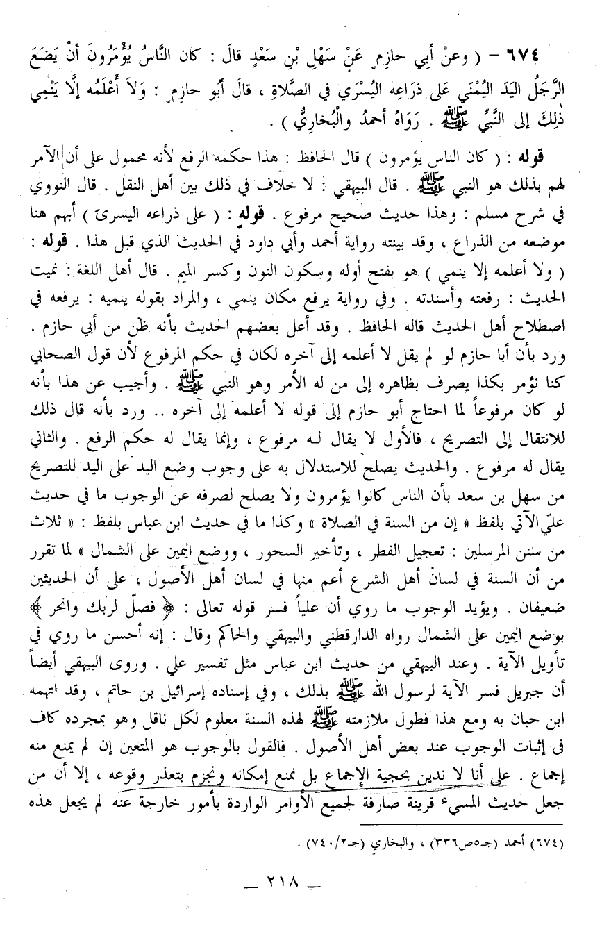 674 - (وَعَنْ أَبِي حَازِمٍ عَنْ سَهْلِ بْنِ سَعْدٍ قَالَ: «كَانَ النَّاسُ يُؤْمَرُونَ أَنْ يَضَعَ الرَّجُلُ الْيَدَ الْيُمْنَى عَلَى ذِرَاعِهِ الْيُسْرَى فِي الصَّلَاةِ، قَالَ أَبُو حَازِمٍ: وَلَا أَعْلَمُهُ إلَّا يَنْمِي ذَلِكَ إلَى النَّبِيِّ - صَلَّى اللَّهُ عَلَيْهِ وَسَلَّمَ -» رَوَاهُ أَحْمَدُ وَالْبُخَارِيُّ)
