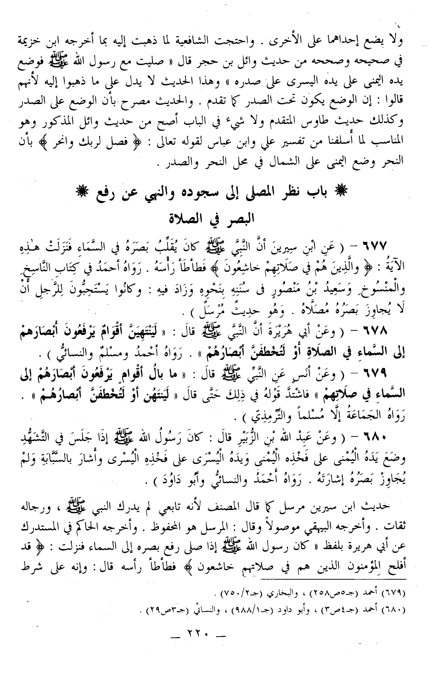677 - (عَنْ ابْنِ سِيرِينَ «أَنَّ النَّبِيَّ - صَلَّى اللَّهُ عَلَيْهِ وَسَلَّمَ - كَانَ يُقَلِّبُ بَصَرَهُ فِي السَّمَاءِ فَنَزَلَتْ هَذِهِ الْآيَةُ: {الَّذِينَ هُمْ فِي صَلاتِهِمْ خَاشِعُونَ} [المؤمنون: 2] فَطَأْطَأَ رَأْسَهُ.» رَوَاهُ أَحْمَدُ فِي كِتَابِ النَّاسِخِ وَالْمَنْسُوخِ وَسَعِيدُ بْنُ مَنْصُورٍ فِي سُنَنِهِ بِنَحْوِهِ وَزَادَ فِيهِ: «وَكَانُوا يَسْتَحِبُّونَ لِلرَّجُلِ أَنْ لَا يُجَاوِزَ بَصَرُهُ مُصَلَّاهُ.» وَهُوَ حَدِيثٌ مُرْسَلٌ) .