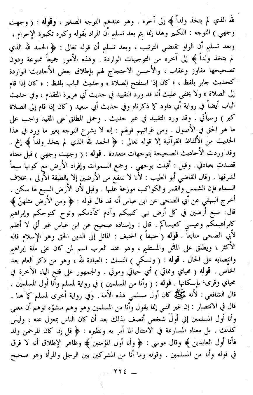 قَوْلُهُ (حَنِيفًا) الْحَنِيفُ: الْمَائِلُ إلَى الدِّينِ الْحَقِّ وَهُوَ الْإِسْلَامُ قَالَهُ الْأَكْثَرُ، وَيُطْلَقُ عَلَى الْمَائِلِ وَالْمُسْتَقِيمِ، وَهُوَ عِنْدِ الْعَرَبِ اسْمٌ لِمَنْ كَانَ عَلَى مِلَّةِ إبْرَاهِيمَ وَانْتِصَابُهُ عَلَى الْحَالِ. قَوْلُهُ: (وَنُسُكِي) النُّسُكُ: الْعِبَادَةُ لِلَّهِ، وَهُوَ مِنْ ذِكْرِ الْعَامِّ بَعْدَ الْخَاصِّ. قَوْلُهُ (مَحْيَايَ وَمَمَاتِي) أَيْ حَيَاتِي وَمَوْتِي. وَالْجُمْهُورُ عَلَى فَتْحِ الْيَاءِ الْآخِرَةِ فِي مَحْيَايَ وَقُرِئَ بِإِسْكَانِهَا. قَوْلُهُ: (وَأَنَا مِنْ الْمُسْلِمِينَ) فِي رِوَايَةٍ لِمُسْلِمٍ وَأَنَا أَوَّلُ الْمُسْلِمِينَ. قَالَ الشَّافِعِيُّ: لِأَنَّهُ - صَلَّى اللَّهُ عَلَيْهِ وَسَلَّمَ - كَانَ أَوَّلَ مُسْلِمِي هَذِهِ الْأُمَّةِ.