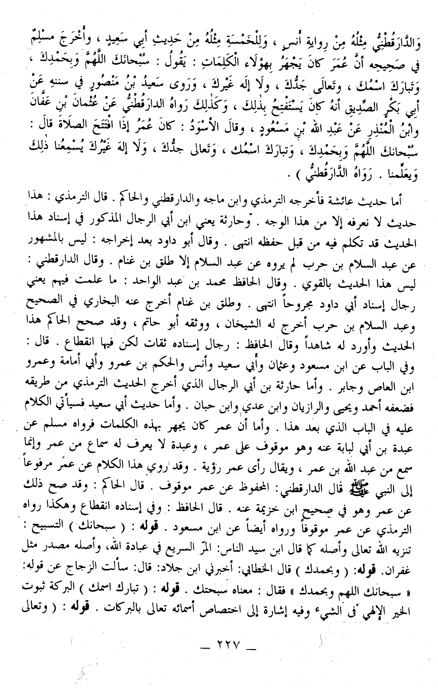 أَمَّا حَدِيثُ عَائِشَةَ فَأَخْرَجَهُ التِّرْمِذِيُّ وَابْنُ مَاجَهْ وَالدَّارَقُطْنِيّ وَالْحَاكِمُ. قَالَ التِّرْمِذِيُّ: هَذَا حَدِيثٌ لَا نَعْرِفُهُ إلَّا مِنْ هَذَا الْوَجْهِ. وَحَارِثَةُ يَعْنِي ابْنَ أَبِي الرِّجَالِ الْمَذْكُورَ فِي إسْنَادِ هَذَا الْحَدِيثِ قَدْ تَكَلَّمَ فِيهِ مِنْ قِبَلِ حِفْظِهِ انْتَهَى. وَقَالَ أَبُو دَاوُد بَعْدَ إخْرَاجِهِ: لَيْسَ بِالْمَشْهُورِ عَنْ عَبْدِ السَّلَامِ بْنِ حَرْبٍ لَمْ يَرْوِهِ عَنْ عَبْدِ السَّلَامِ إلَّا طَلْقُ بْنُ غَنَّامٍ. وَقَالَ الدَّارَقُطْنِيّ: لَيْسَ هَذَا الْحَدِيثُ بِالْقَوِيِّ. وَقَالَ الْحَافِظُ مُحَمَّدُ بْنُ عَبْدِ الْوَاحِدِ: مَا عَلِمْت فِيهِمْ يَعْنِي رِجَالُ إسْنَادِ أَبِي دَاوُد مَجْرُوحًا انْتَهَى. وَطَلْقُ بْنُ غَنَّامٍ أَخْرَجَ عَنْهُ الْبُخَارِيُّ فِي الصَّحِيحِ وَعَبْدُ السَّلَامِ بْنُ حَرْبٍ أَخْرَجَ لَهُ الشَّيْخَانِ، وَوَثَّقَهُ أَبُو حَاتِمٍ، وَقَدْ صَحَّحَ الْحَاكِمُ هَذَا الْحَدِيثَ وَأَوْرَدَ لَهُ شَاهِدًا وَقَالَ الْحَافِظُ: رِجَالُ إسْنَادِهِ ثِقَاتٌ لَكِنْ فِيهَا انْقِطَاعٌ. قَالَ: وَفِي الْبَابِ عَنْ ابْنِ مَسْعُودٍ وَعُثْمَانَ وَأَبِي سَعِيدٍ وَأَنَسٍ وَالْحَكَمِ بْنِ عَمْرِو وَأَبِي أُمَامَةَ وَعَمْرِو بْنِ الْعَاصِ وَجَابِرٍ وَأَمَّا حَارِثَةُ بْنُ أَبِي الرِّجَالِ الَّذِي أَخْرَجَ الْحَدِيثَ التِّرْمِذِيُّ مِنْ طَرِيقِهِ فَضَعَّفَهُ أَحْمَدُ وَيَحْيَى وَالرَّازِيَّانِ وَابْنُ عَدِيٍّ وَابْنُ حِبَّانَ. وَأَمَّا حَدِيثُ أَبِي سَعِيدٍ فَسَيَأْتِي الْكَلَامُ عَلَيْهِ فِي الْبَابِ الَّذِي بَعْدَ هَذَا. وَأَمَّا إنَّ عُمَرَ كَانَ يَجْهَرُ بِهَذِهِ الْكَلِمَاتِ فَرَوَاهُ مُسْلِمٌ عَنْ عَبْدَةَ بْنِ أَبِي لُبَابَةَ عَنْهُ وَهُوَ مَوْقُوفٌ عَلَى عُمَرَ، وَعَبْدَةُ لَا يُعْرَفُ لَهُ سَمَاعٌ مِنْ عُمَرَ وَإِنَّمَا سَمِعَ مِنْ عَبْدِ اللَّهِ بْنِ عُمَرَ، وَيُقَالُ رَأَى عُمَرَ رُؤْيَةً. وَقَدْ رُوِيَ هَذَا الْكَلَامُ عَنْ عُمَرَ مَرْفُوعًا إلَى النَّبِيِّ - صَلَّى اللَّهُ عَلَيْهِ وَسَلَّمَ - قَالَ الدَّارَقُطْنِيّ: الْمَحْفُوظُ عَنْ عُمَرَ مَوْقُوفٌ. قَالَ الْحَاكِمُ: وَقَدْ صَحَّ ذَلِكَ عَنْ عُمَرَ وَهُوَ فِي صَحِيحِ ابْنِ خُزَيْمَةَ عَنْهُ. قَالَ الْحَافِظُ: وَفِي إسْنَادِهِ انْقِطَاعٌ وَهَكَذَا رَوَاهُ التِّرْمِذِيُّ عَنْ عُمَرَ مَوْقُوفًا وَرَوَاهُ أَيْضًا عَنْ ابْنِ مَسْعُودٍ. قَوْلُهُ: (سُبْحَانَك) التَّسْبِيحُ: تَنْزِيهُ اللَّهِ تَعَالَى وَأَصْلُهُ كَمَا قَالَ ابْنُ سَيِّدِ النَّاسِ: الْمَرُّ السَّرِيعُ فِي عِبَادَةِ اللَّهِ، وَأَصْلُهُ مَصْدَرٌ مِثْلَ غُفْرَانٍ. قَوْلُهُ: (وَبِحَمْدِك) قَالَ الْخَطَّابِيِّ: أَخْبَرَنِي ابْنُ جَلَّادٍ: قَالَ: سَأَلْت الزَّجَّاجَ عَنْ قَوْلِهِ: " سُبْحَانَك اللَّهُمَّ وَبِحَمْدِك " فَقَالَ: مَعْنَاهُ سَبَّحْتُك. قَوْلُهُ: (تَبَارَكَ اسْمُك) الْبَرَكَةُ ثُبُوتُ الْخَيْرِ الْإِلَهِيِّ فِي الشَّيْءِ وَفِيهِ إشَارَةٌ إلَى اخْتِصَاصِ أَسْمَائِهِ تَعَالَى بِالْبَرَكَاتِ. قَوْلُهُ: (وَتَعَالَى