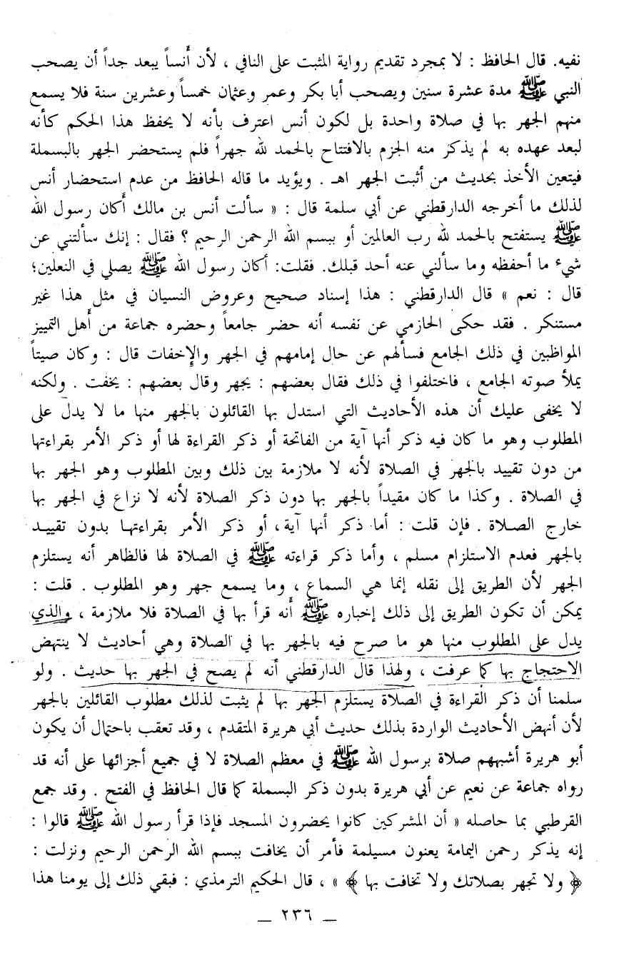 قَالَ الْحَافِظُ: لَا بِمُجَرَّدِ تَقْدِيمِ رِوَايَةِ الْمُثَبِّتِ عَلَى النَّافِي، لِأَنَّ أَنَسًا يَبْعُدُ جِدًّا أَنْ يَصْحَبَ النَّبِيَّ - صَلَّى اللَّهُ عَلَيْهِ وَسَلَّمَ - مُدَّةَ عَشْرَةِ سِنِينَ وَيَصْحَبُ أَبَا بَكْرٍ وَعُمَرَ وَعُثْمَانَ خَمْسًا وَعِشْرِينَ سَنَةً فَلَا يَسْمَع مِنْهُمْ الْجَهْرَ بِهَا فِي صَلَاةٍ وَاحِدَةٍ بَلْ لِكَوْنِ أَنَسٍ اعْتَرَفَ بِأَنَّهُ لَا يَحْفَظُ هَذَا الْحُكْمَ كَأَنَّهُ لِبُعْدِ عَهْدِهِ بِهِ لَمْ يَذْكُرْ مِنْهُ الْجَزْمَ بِالِافْتِتَاحِ بِالْحَمْدِ لِلَّهِ جَهْرًا فَلَمْ يَسْتَحْضِرْ الْجَهْرَ بِالْبَسْمَلَةِ فَيَتَعَيَّنُ الْأَخْذُ بِحَدِيثِ مَنْ أَثْبَتَ الْجَهْرَ اهـ.