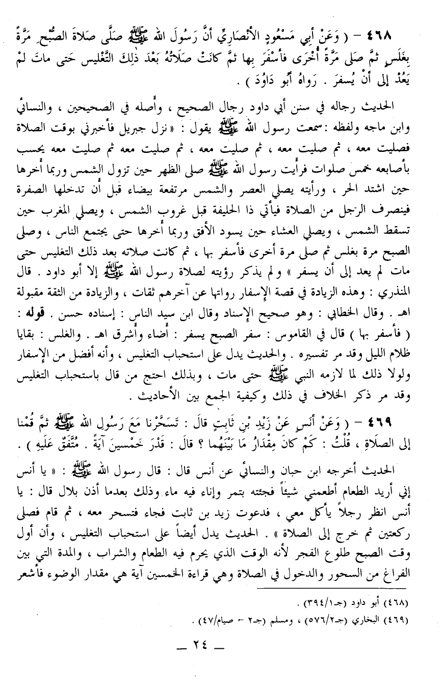 468 - (وَعَنْ أَبِي مَسْعُودٍ الْأَنْصَارِيِّ «أَنَّ رَسُولَ اللَّهِ - صَلَّى اللَّهُ عَلَيْهِ وَسَلَّمَ - صَلَّى صَلَاةَ الصُّبْحِ مَرَّةً بِغَلَسٍ ثُمَّ صَلَّى مَرَّةً أُخْرَى فَأَسْفَرَ بِهَا ثُمَّ كَانَتْ صَلَاتُهُ بَعْد ذَلِكَ التَّغْلِيسَ حَتَّى مَاتَ لَمْ يَعُدْ إلَى أَنْ يُسْفِرَ» رَوَاهُ أَبُو دَاوُد)