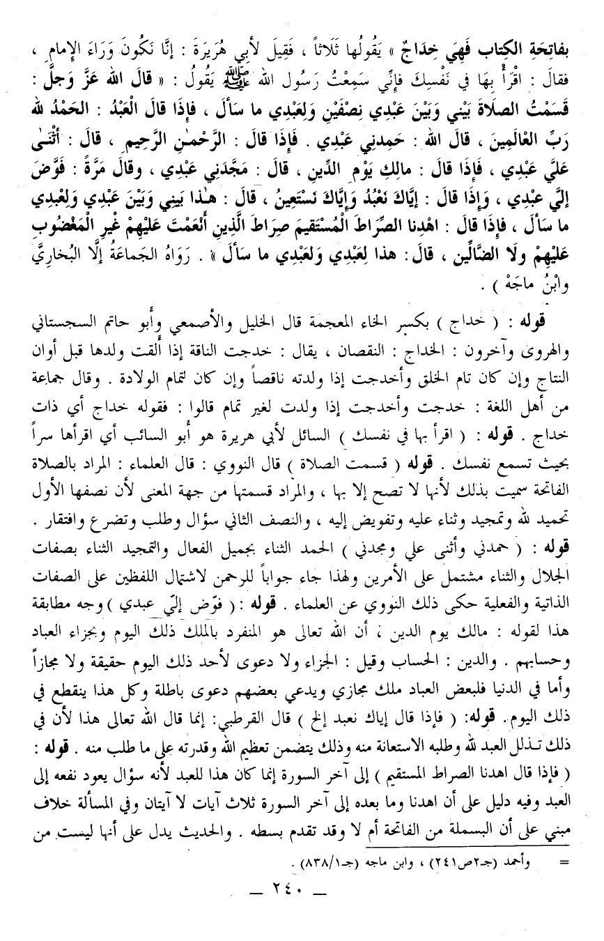 بِفَاتِحَةِ الْكِتَابِ فَهِيَ خِدَاجٌ يَقُولُهَا ثَلَاثًا، فَقِيلَ لِأَبِي هُرَيْرَةَ: إنَّا نَكُونُ وَرَاءَ الْإِمَامِ، فَقَالَ: اقْرَأْ بِهَا فِي نَفْسِك فَإِنِّي سَمِعْت رَسُولَ اللَّهِ - صَلَّى اللَّهُ عَلَيْهِ وَسَلَّمَ - يَقُولُ: قَالَ اللَّهُ عَزَّ وَجَلَّ: قَسَمْت الصَّلَاةَ بَيْنِي وَبَيْنَ عَبْدِي نِصْفَيْنِ وَلِعَبْدِي مَا سَأَلَ، فَإِذَا قَالَ الْعَبْدُ: الْحَمْدُ لِلَّهِ رَبِّ الْعَالَمِينَ، قَالَ اللَّهُ: حَمِدَنِي عَبْدِي. فَإِذَا قَالَ: الرَّحْمَنِ الرَّحِيمِ، قَالَ: أَثْنَى عَلَيَّ عَبْدِي، فَإِذَا قَالَ: مَالِكِ يَوْمِ الدِّينِ، قَالَ: مَجَّدَنِي عَبْدِي، وَقَالَ مَرَّةً: فَوَّضَ إلَيَّ عَبْدِي، وَإِذَا قَالَ: إيَّاكَ نَعْبُدُ وَإِيَّاكَ نَسْتَعِينُ، قَالَ: هَذَا بَيْنِي وَبَيْنَ عَبْدِي وَلِعَبْدِي مَا سَأَلَ، فَإِذَا قَالَ: اهْدِنَا الصِّرَاطَ الْمُسْتَقِيمَ صِرَاطَ الَّذِينَ أَنْعَمْت عَلَيْهِمْ غَيْرِ الْمَغْضُوبِ عَلَيْهِمْ وَلَا الضَّالِّينَ، قَالَ: هَذَا لِعَبْدِي وَلِعَبْدِي مَا سَأَلَ» . رَوَاهُ الْجَمَاعَةُ إلَّا الْبُخَارِيَّ وَابْنَ مَاجَهْ) .