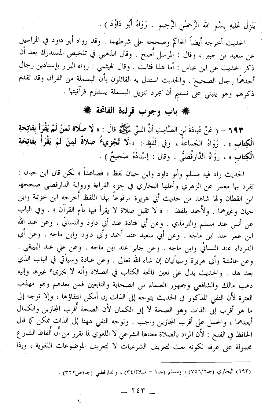 693 - (عَنْ عُبَادَةَ بْنِ الصَّامِتِ أَنَّ النَّبِيَّ - صَلَّى اللَّهُ عَلَيْهِ وَسَلَّمَ - قَالَ: «لَا صَلَاةَ لِمَنْ لَمْ يَقْرَأْ بِفَاتِحَةِ الْكِتَابِ» . رَوَاهُ الْجَمَاعَةُ، وَفِي لَفْظٍ: «لَا صَلَاةَ لِمَنْ لَمْ يَقْرَأْ بِفَاتِحَةِ الْكِتَابِ» ، رَوَاهُ الدَّارَقُطْنِيّ. وَقَالَ: إسْنَادُهُ صَحِيحٌ) .