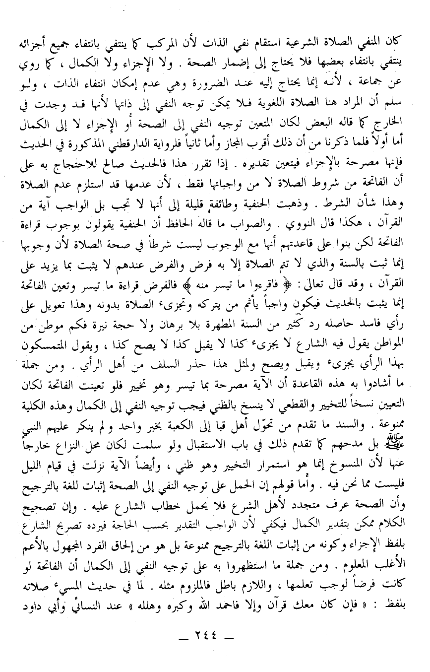 وَلَا الْإِجْزَاءِ وَلَا الْكَمَالِ، كَمَا رُوِيَ عَنْ جَمَاعَةٍ، لِأَنَّهُ إنَّمَا يُحْتَاجُ إلَيْهِ عِنْدَ الضَّرُورَةِ وَهِيَ عَدَمُ إمْكَانِ انْتِفَاءِ الذَّاتِ، وَلَوْ سُلِّمَ أَنَّ الْمُرَادَ هُنَا الصَّلَاةُ اللُّغَوِيَّةُ فَلَا يُمْكِنُ تَوَجُّهُ النَّفْيِ إلَى ذَاتِهَا لِأَنَّهَا قَدْ وُجِدَتْ فِي الْخَارِجِ كَمَا قَالَهُ الْبَعْضُ لَكَانَ تَوْجِيهُ النَّفْيِ إلَى الصِّحَّةِ أَوْ الْإِجْزَاءِ لَا إلَى الْكَمَالِ أَمَّا أَوَّلًا فَلِمَا ذَكَرْنَا مِنْ أَنَّ ذَلِكَ أَقْرَبُ الْمَجَازِ وَأَمَّا ثَانِيًا فَلِرِوَايَةِ الدَّارَقُطْنِيّ الْمَذْكُورَةِ فِي الْحَدِيثِ فَإِنَّهَا مُصَرِّحَةٌ بِالْإِجْزَاءِ فَيَتَعَيَّنُ تَقْدِيرُهُ. إذَا تَقَرَّرَ هَذَا فَالْحَدِيثُ صَالِحٌ لِلِاحْتِجَاجِ بِهِ عَلَى أَنَّ الْفَاتِحَةَ مِنْ شُرُوطِ الصَّلَاةِ لَا مِنْ وَاجِبَاتِهَا فَقَطْ، لِأَنَّ عَدَمَهَا قَدْ اسْتَلْزَمَ عَدَمَ الصَّلَاةِ وَهَذَا شَأْنُ الشَّرْطِ. وَذَهَبَتْ الْحَنَفِيَّةُ وَطَائِفَةٌ قَلِيلَةٌ إلَى أَنَّهَا لَا تَجِبُ بَلْ الْوَاجِبُ آيَةٌ مِنْ الْقُرْآنِ، هَكَذَا قَالَ النَّوَوِيُّ. وَالصَّوَابُ مَا قَالَهُ الْحَافِظُ أَنَّ الْحَنَفِيَّةَ يَقُولُونَ بِوُجُوبِ قِرَاءَةِ الْفَاتِحَةِ لَكِنْ بَنَوْا عَلَى قَاعِدَتِهِمْ أَنَّهَا مَعَ الْوُجُوبِ لَيْسَتْ شَرْطًا فِي صِحَّةِ الصَّلَاةِ لِأَنَّ وُجُوبَهَا إنَّمَا ثَبَتَ بِالسُّنَّةِ وَاَلَّذِي لَا تَتِمُّ الصَّلَاةُ إلَّا بِهِ فَرْضٌ وَالْفَرْضُ عِنْدَهُمْ لَا يَثْبُتُ بِمَا يَزِيدُ عَلَى الْقُرْآنِ، وَقَدْ قَالَ تَعَالَى: {فَاقْرَءُوا مَا تَيَسَّرَ مِنْهُ} [المزمل: 20] فَالْفَرْضُ قِرَاءَةُ مَا تَيَسَّرَ وَتَعَيُّنُ الْفَاتِحَةِ إنَّمَا يَثْبُتُ بِالْحَدِيثِ فَيَكُونُ وَاجِبًا يَأْثَمُ مَنْ يَتْرُكُهُ وَتُجْزِئُ الصَّلَاةُ بِدُونِهِ.