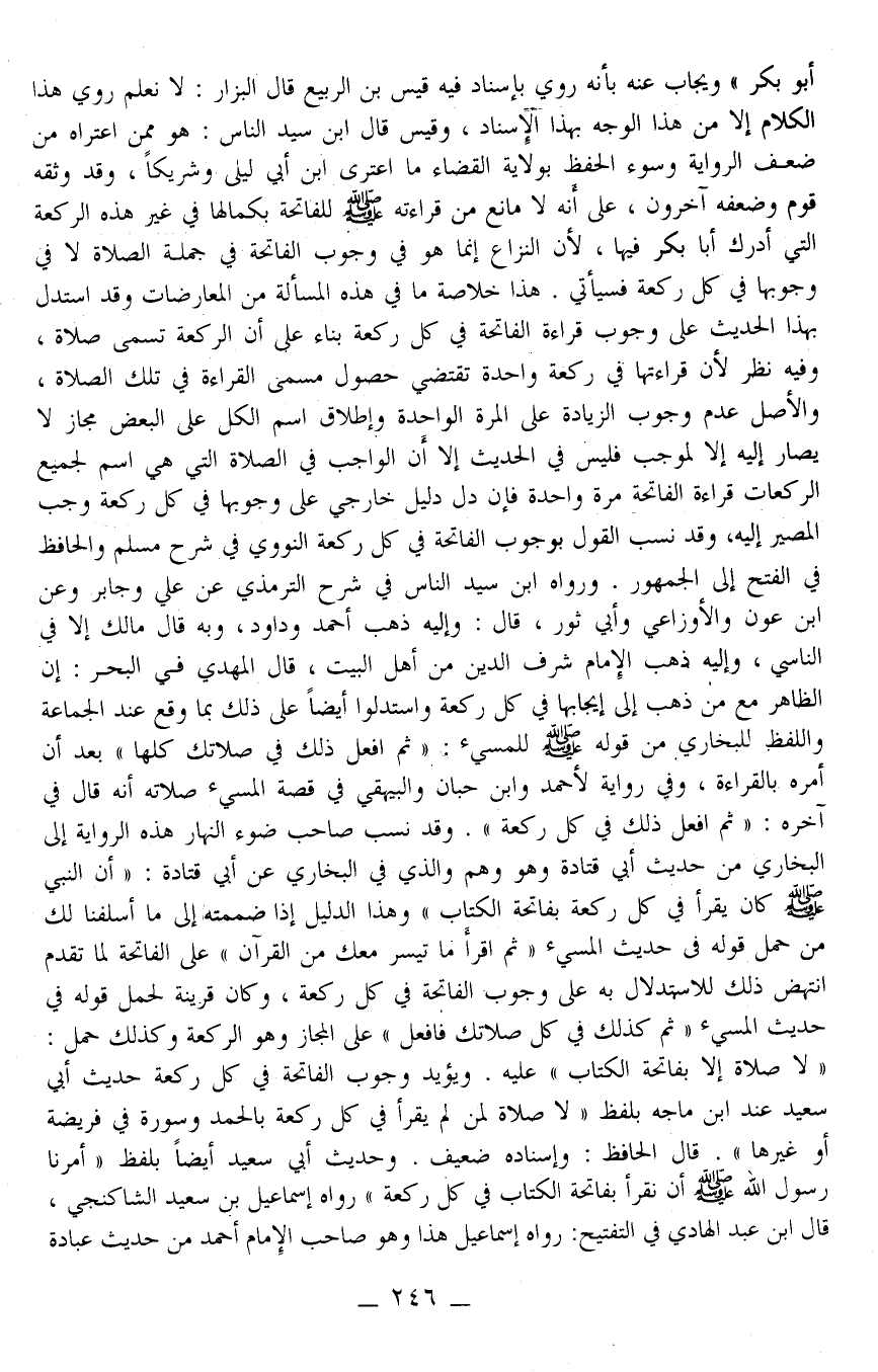 هَذَا خُلَاصَةُ مَا فِي هَذِهِ الْمَسْأَلَةِ مِنْ الْمُعَارَضَاتِ وَقَدْ اُسْتُدِلَّ بِهَذَا الْحَدِيثِ عَلَى وُجُوبِ قِرَاءَةِ الْفَاتِحَةِ فِي كُلِّ رَكْعَةٍ بِنَاءً عَلَى أَنَّ الرَّكْعَةَ تُسَمَّى صَلَاةً، وَفِيهِ نَظَرٌ لِأَنَّ قِرَاءَتَهَا فِي رَكْعَةٍ وَاحِدَةٍ تَقْتَضِي حُصُولَ مُسَمَّى الْقِرَاءَةِ فِي تِلْكَ الصَّلَاةِ، وَالْأَصْلُ عَدَمُ وُجُوبِ الزِّيَادَةِ عَلَى الْمَرَّةِ الْوَاحِدَةِ وَإِطْلَاقُ اسْمِ الْكُلِّ عَلَى الْبَعْضِ مَجَازٌ لَا يُصَارُ إلَيْهِ إلَّا لِمُوجَبٍ فَلَيْسَ فِي الْحَدِيثِ إلَّا أَنَّ الْوَاجِبَ فِي الصَّلَاةِ الَّتِي هِيَ اسْمٌ لِجَمِيعِ الرَّكَعَاتِ قِرَاءَةُ الْفَاتِحَةِ مَرَّةً وَاحِدَةً فَإِنْ دَلَّ دَلِيلٌ خَارِجِيٌّ عَلَى وُجُوبِهَا فِي كُلِّ رَكْعَةٍ وَجَبَ الْمَصِيرُ إلَيْهِ، وَقَدْ نَسَبَ الْقَوْلَ بِوُجُوبِ الْفَاتِحَةِ فِي كُلِّ رَكْعَةٍ النَّوَوِيُّ فِي شَرْحِ مُسْلِمٍ وَالْحَافِظُ فِي الْفَتْحِ إلَى الْجُمْهُورِ