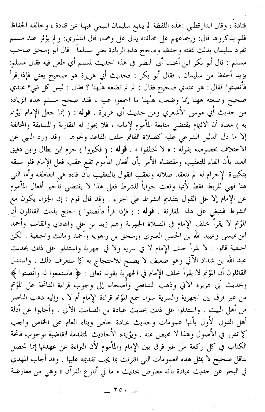 ـــــــــــــــــــــــــــــQقَتَادَةَ، وَقَالَ الدَّارَقُطْنِيّ: هَذِهِ اللَّفْظَةُ لَمْ يُتَابَعْ سُلَيْمَانُ التَّيْمِيُّ فِيهَا عَنْ قَتَادَةَ، وَخَالَفَهُ الْحُفَّاظُ فَلَمْ يَذْكُرُوهَا قَالَ: وَإِجْمَاعُهُمْ عَلَى مُخَالِفَتِهِ يَدُلُّ عَلَى وَهْمِهِ، قَالَ الْمُنْذِرِيُّ: وَلَمْ يُؤْثَرْ عِنْدَ مُسْلِمٍ تَفَرُّدُ سُلَيْمَانَ بِذَلِكَ لِثِقَتِهِ وَحِفْظِهِ وَصَحَّحَ هَذِهِ الزِّيَادَةَ يَعْنِي مُسْلِمًا. قَالَ أَبُو إِسْحَاقَ صَاحِبُ مُسْلِمٍ: قَالَ أَبُو بَكْرِ ابْنُ أُخْتِ أَبِي النَّضْرِ فِي هَذَا الْحَدِيثِ لِمُسْلِمٍ أَيْ طَعَنَ فِيهِ فَقَالَ مُسْلِمٌ: يَزِيدُ أَحْفَظُ مِنْ سُلَيْمَانَ، فَقَالَ أَبُو بَكْرٍ: فَحَدِيثُ أَبِي هُرَيْرَةَ هُوَ صَحِيحٌ يَعْنِي «فَإِذَا قَرَأَ فَأَنْصِتُوا» فَقَالَ: هُوَ عِنْدِي صَحِيحٌ فَقَالَ: لِمَ لَمْ تَضَعْهُ هَهُنَا؟ فَقَالَ: لَيْسَ كُلُّ شَيْءٍ عِنْدِي صَحِيحٌ وَضَعْته هَهُنَا إنَّمَا وَضَعْت هَهُنَا مَا أَجْمَعُوا عَلَيْهِ، فَقَدْ صَحَّحَ مُسْلِمٌ هَذِهِ الزِّيَادَةَ مِنْ حَدِيثِ أَبِي مُوسَى الْأَشْعَرِيِّ وَمِنْ حَدِيثِ أَبِي هُرَيْرَةَ
