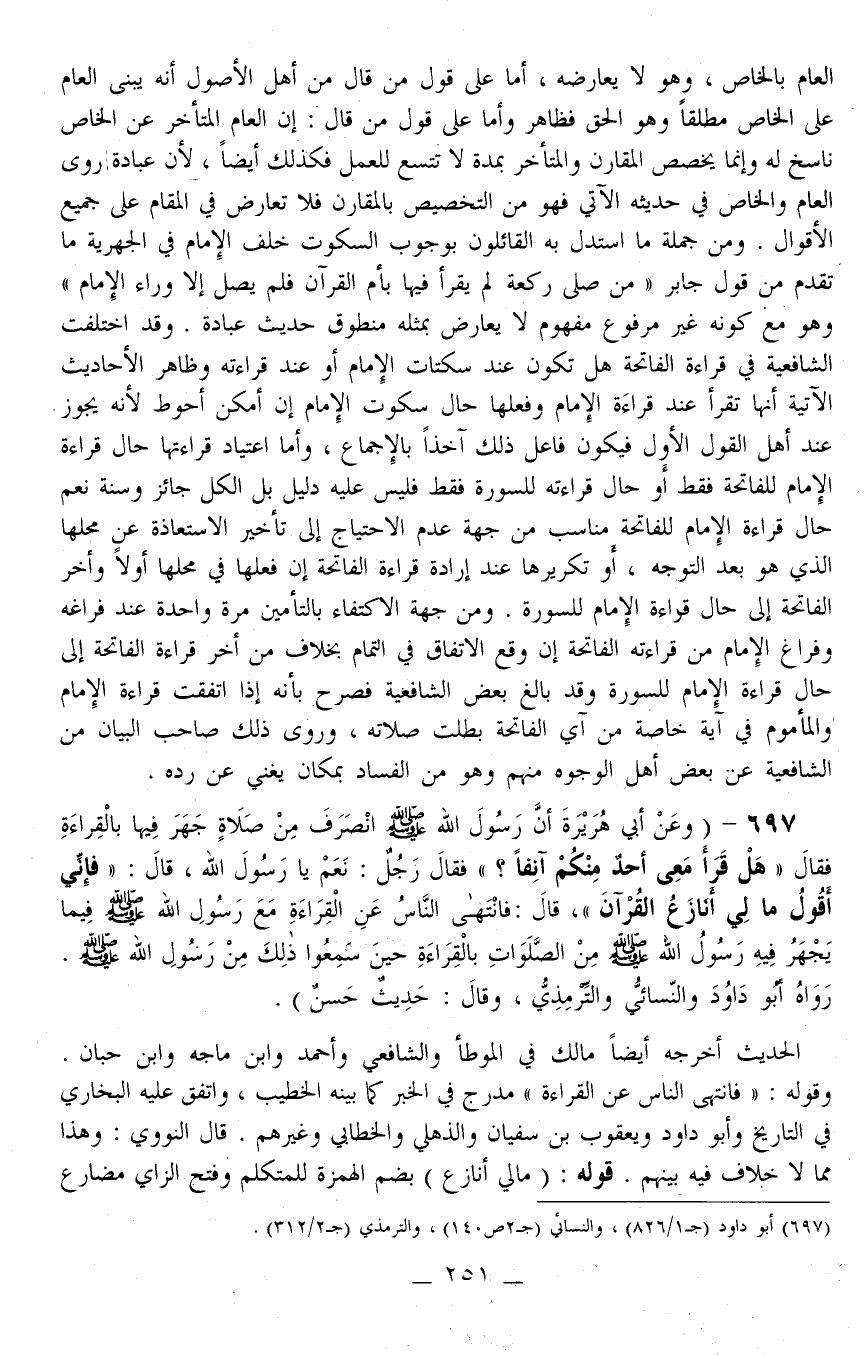 697 - (وَعَنْ أَبِي هُرَيْرَةَ أَنَّ رَسُولَ اللَّهِ - صَلَّى اللَّهُ عَلَيْهِ وَسَلَّمَ - انْصَرَفَ مِنْ صَلَاةٍ جَهَرَ فِيهَا بِالْقِرَاءَةِ فَقَالَ «هَلْ قَرَأَ مَعِي أَحَدٌ مِنْكُمْ آنِفًا؟» فَقَالَ رَجُلٌ: نَعَمْ يَا رَسُولَ اللَّهِ، قَالَ: «فَإِنِّي أَقُولُ مَا لِي أُنَازَعُ الْقُرْآنَ» ، قَالَ: فَانْتَهَى النَّاسُ عَنْ الْقِرَاءَةِ مَعَ رَسُولِ اللَّهِ - صَلَّى اللَّهُ عَلَيْهِ وَسَلَّمَ - فِيمَا يَجْهَرُ فِيهِ رَسُولُ اللَّهِ - صَلَّى اللَّهُ عَلَيْهِ وَسَلَّمَ - مِنْ الصَّلَوَاتِ بِالْقِرَاءَةِ حِينَ سَمِعُوا ذَلِكَ مِنْ رَسُولِ اللَّهِ - صَلَّى اللَّهُ عَلَيْهِ وَسَلَّمَ - رَوَاهُ أَبُو دَاوُد وَالنَّسَائِيُّ وَالتِّرْمِذِيُّ، وَقَالَ: حَدِيثٌ حَسَنٌ) .