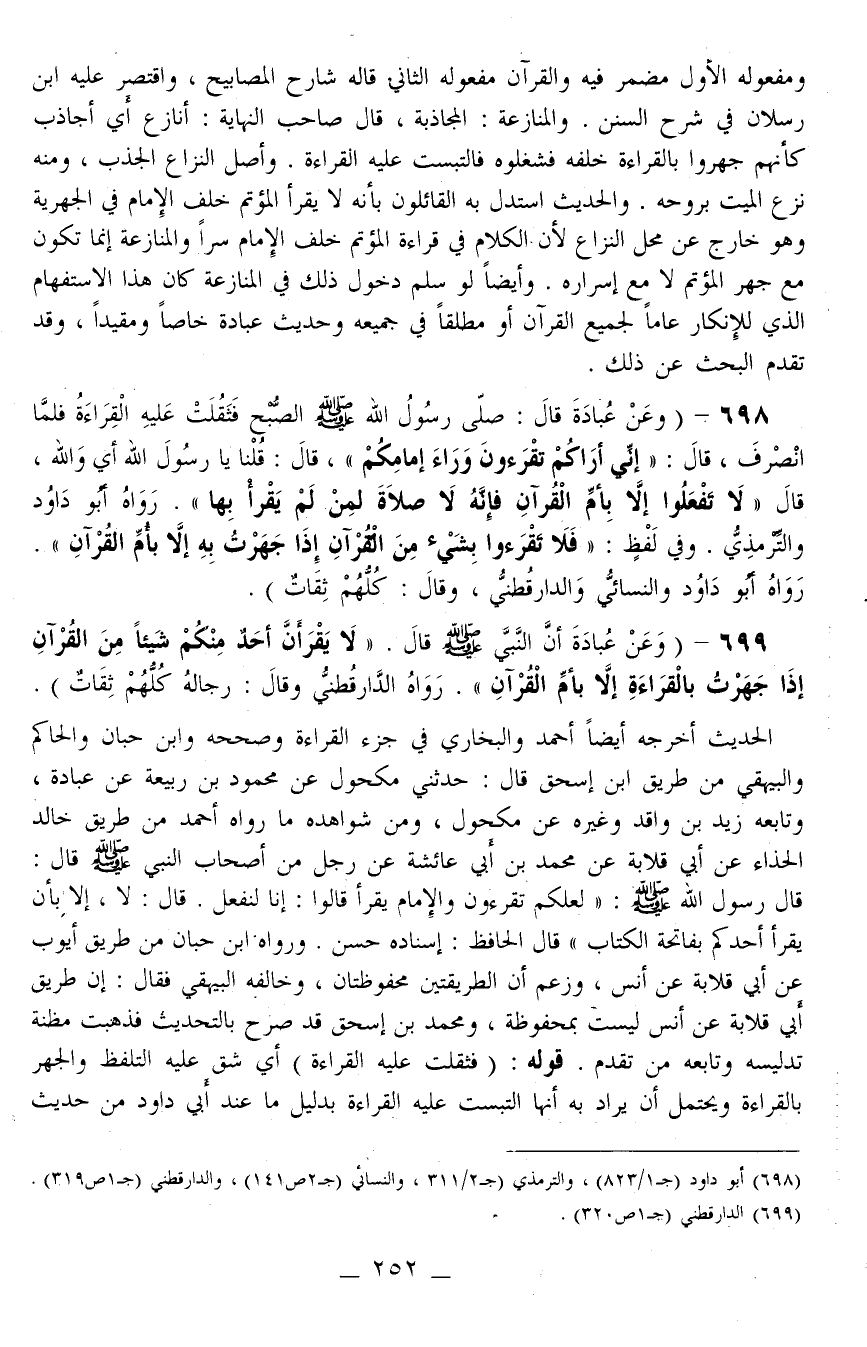 الْحَدِيثُ أَخْرَجَهُ أَيْضًا أَحْمَدُ وَالْبُخَارِيُّ فِي جُزْءِ الْقِرَاءَةِ وَصَحَّحَهُ وَابْنُ حِبَّانَ وَالْحَاكِمُ وَالْبَيْهَقِيُّ مِنْ طَرِيقِ ابْنِ إِسْحَاقَ قَالَ: حَدَّثَنِي مَكْحُولٌ عَنْ مَحْمُودِ بْنِ رَبِيعَةَ عَنْ عُبَادَةَ، وَتَابَعَهُ زَيْدُ بْنُ وَاقِدٍ وَغَيْرُهُ عَنْ مَكْحُولٍ، وَمِنْ شَوَاهِدِهِ مَا رَوَاهُ أَحْمَدُ مِنْ طَرِيقِ خَالِدٍ الْحَذَّاءِ عَنْ أَبِي قِلَابَةَ عَنْ مُحَمَّدِ بْنِ أَبِي عَائِشَةَ عَنْ رَجُلٍ مِنْ أَصْحَابِ النَّبِيِّ - صَلَّى اللَّهُ عَلَيْهِ وَسَلَّمَ - قَالَ: قَالَ رَسُولُ اللَّهِ - صَلَّى اللَّهُ عَلَيْهِ وَسَلَّمَ -: «لَعَلَّكُمْ تَقْرَءُونَ وَالْإِمَامُ يَقْرَأُ قَالُوا: إنَّا لَنَفْعَلُ. قَالَ: لَا، إلَّا بِأَنْ يَقْرَأَ أَحَدُكُمْ بِفَاتِحَةِ الْكِتَابِ» قَالَ الْحَافِظُ: إسْنَادُهُ حَسَنٌ. وَرَوَاهُ ابْنُ حِبَّانَ مِنْ طَرِيقِ أَيُّوبَ عَنْ أَبِي قِلَابَةَ عَنْ أَنَسٍ، وَزَعَمَ أَنَّ الطَّرِيقَتَيْنِ مَحْفُوظَتَانِ، وَخَالَفَهُ الْبَيْهَقِيُّ فَقَالَ: إنَّ طَرِيقَ أَبِي قِلَابَةَ عَنْ أَنَسٍ لَيْسَتْ بِمَحْفُوظَةٍ، وَمُحَمَّدُ بْنُ إِسْحَاقَ قَدْ صَرَّحَ بِالتَّحْدِيثِ فَذَهَبَتْ مَظِنَّةُ تَدْلِيسِهِ وَتَابَعَهُ مَنْ تَقَدَّمَ