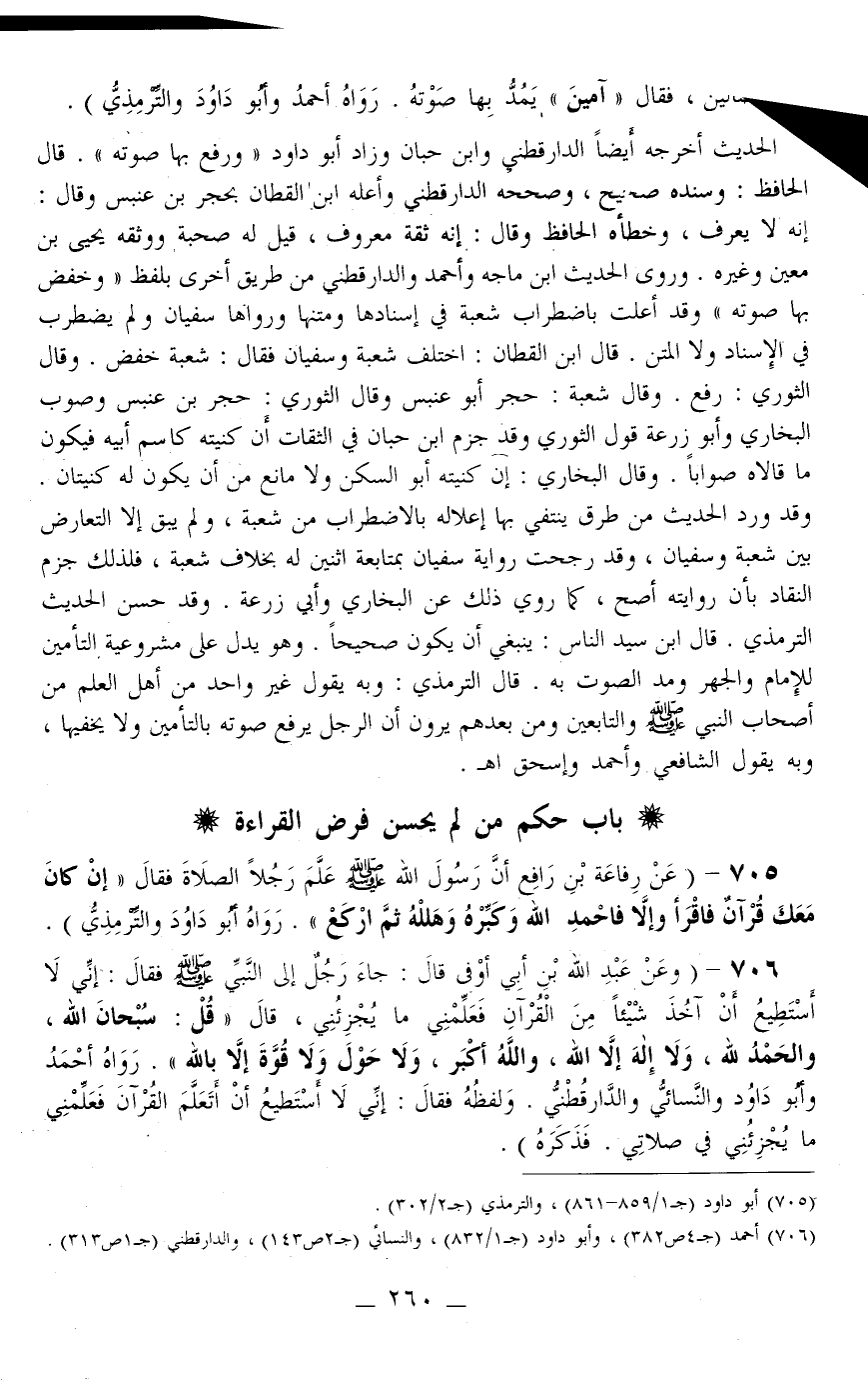 ـــــــــــــــــــــــــــــQالْحَدِيثُ أَخْرَجَهُ أَيْضًا الدَّارَقُطْنِيّ وَابْنُ حِبَّانَ وَزَادَ أَبُو دَاوُد «وَرَفَعَ بِهَا صَوْتَهُ» . قَالَ الْحَافِظُ: وَسَنَدُهُ صَحِيحٌ، وَصَحَّحَهُ الدَّارَقُطْنِيّ وَأَعَلَّهُ ابْنُ الْقَطَّانِ بِحُجْرِ بْنِ عَنْبَسٍ وَقَالَ: إنَّهُ لَا يُعْرَفُ، وَخَطَّأَهُ الْحَافِظُ وَقَالَ: إنَّهُ ثِقَةٌ مَعْرُوفٌ، قِيلَ لَهُ صُحْبَةٌ وَوَثَّقَهُ يَحْيَى بْنُ مَعِينٍ وَغَيْرُهُ وَرَوَى الْحَدِيثَ ابْنُ مَاجَهْ وَأَحْمَدُ وَالدَّارَقُطْنِيّ مِنْ طَرِيقٍ أُخْرَى بِلَفْظِ " وَخَفَضَ بِهَا صَوْتَهُ " وَقَدْ أُعِلَّتْ بِاضْطِرَابِ شُعْبَةَ فِي إسْنَادِهَا وَمَتْنِهَا وَرَوَاهَا سُفْيَانُ وَلَمْ يَضْطَرِب فِي الْإِسْنَادِ وَلَا الْمَتْنِ. قَالَ ابْنُ الْقَطَّانِ: اخْتَلَفَ شُعْبَةُ وَسُفْيَانُ فَقَالَ: شُعْبَةُ خَفَضَ. وَقَالَ الثَّوْرِيُّ: رَفَعَ. وَقَالَ شُعْبَةُ: حُجْرٌ أَبُو عَنْبَسٍ وَقَالَ الثَّوْرِيُّ: حُجْرٌ بْنُ عَنْبَسٍ وَصَوَّبَ الْبُخَارِيُّ وَأَبُو زُرْعَةَ قَوْلَ الثَّوْرِيِّ وَقَدْ جَزَمَ ابْنُ حِبَّانَ فِي الثِّقَاتِ أَنَّ كُنْيَتَهُ كَاسْمِ أَبِيهِ فَيَكُونُ مَا قَالَاهُ صَوَابًا. وَقَالَ الْبُخَارِيُّ: إنَّ كُنْيَتَهُ أَبُو السَّكَنِ وَلَا مَانِعَ مِنْ أَنْ يَكُونَ لَهُ كُنْيَتَانِ. وَقَدْ وَرَدَ الْحَدِيثُ مِنْ طُرُقٍ يَنْتَفِي بِهَا إعْلَالُهُ بِالِاضْطِرَابِ مِنْ شُعْبَةَ، وَلَمْ يَبْقَ إلَّا التَّعَارُضُ بَيْنَ شُعْبَةَ وَسُفْيَانَ، وَقَدْ رُجِّحَتْ رِوَايَةُ سُفْيَانَ بِمُتَابَعَةِ اثْنَيْنِ لَهُ بِخِلَافِ شُعْبَةَ، فَلِذَلِكَ جَزَمَ النُّقَّادُ بِأَنَّ رِوَايَتَهُ أَصَحُّ، كَمَا رُوِيَ ذَلِكَ عَنْ الْبُخَارِيِّ وَأَبِي زُرْعَةَ. وَقَدْ حَسَّنَ الْحَدِيثَ التِّرْمِذِيُّ قَالَ ابْنُ سَيِّدِ النَّاسِ: يَنْبَغِي أَنْ يَكُونَ صَحِيحًا. وَهُوَ يَدُلُّ عَلَى مَشْرُوعِيَّةِ التَّأْمِينِ لِلْإِمَامِ وَالْجَهْرِ وَمَدِّ الصَّوْتِ بِهِ. قَالَ التِّرْمِذِيُّ: وَبِهِ يَقُولُ غَيْرُ وَاحِدٍ مِنْ أَهْلِ الْعِلْمِ مِنْ أَصْحَابِ النَّبِيِّ - صَلَّى اللَّهُ عَلَيْهِ وَسَلَّمَ - وَالتَّابِعِينَ وَمَنْ بَعْدَهُمْ يَرَوْنَ أَنَّ الرَّجُلَ يَرْفَعُ صَوْتَهُ بِالتَّأْمِينِ وَلَا يُخْفِيهَا، وَبِهِ يَقُولُ الشَّافِعِيُّ وَأَحْمَدُ وَإِسْحَاقُ اهـ.