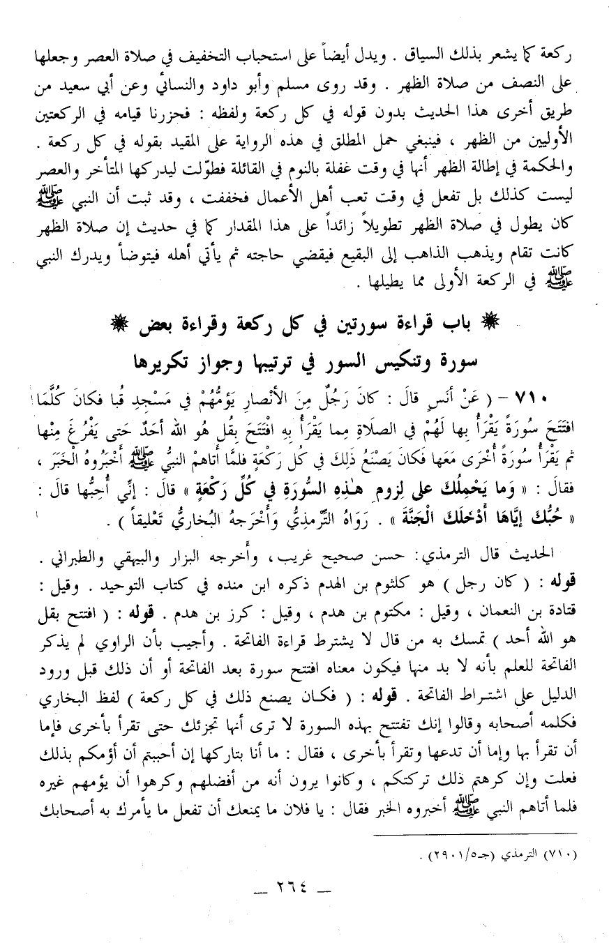 710 - (عَنْ أَنَسٍ قَالَ: «كَانَ رَجُلٌ مِنْ الْأَنْصَارِ يَؤُمُّهُمْ فِي مَسْجِدِ قُبَاءَ فَكَانَ كُلَّمَا افْتَتَحَ سُورَةً يَقْرَأُ بِهَا لَهُمْ فِي الصَّلَاةِ مِمَّا يَقْرَأُ بِهِ افْتَتَحَ بِ {قُلْ هُوَ اللَّهُ أَحَدٌ} [الإخلاص: 1] حَتَّى يَفْرُغَ مِنْهَا ثُمَّ يَقْرَأُ سُورَةً أُخْرَى مَعَهَا فَكَانَ يَصْنَعُ ذَلِكَ فِي كُلِّ رَكْعَةٍ فَلَمَّا أَتَاهُمْ النَّبِيُّ - صَلَّى اللَّهُ عَلَيْهِ وَسَلَّمَ - أَخْبَرُوهُ الْخَبَرَ، فَقَالَ: وَمَا يَحْمِلُكَ عَلَى لُزُومِ هَذِهِ السُّورَةِ فِي كُلِّ رَكْعَةٍ قَالَ: إنِّي أُحِبُّهَا قَالَ: حُبُّكَ إيَّاهَا أَدْخَلَكَ الْجَنَّةَ» . رَوَاهُ التِّرْمِذِيُّ وَأَخْرَجَهُ الْبُخَارِيُّ تَعْلِيقًا) .