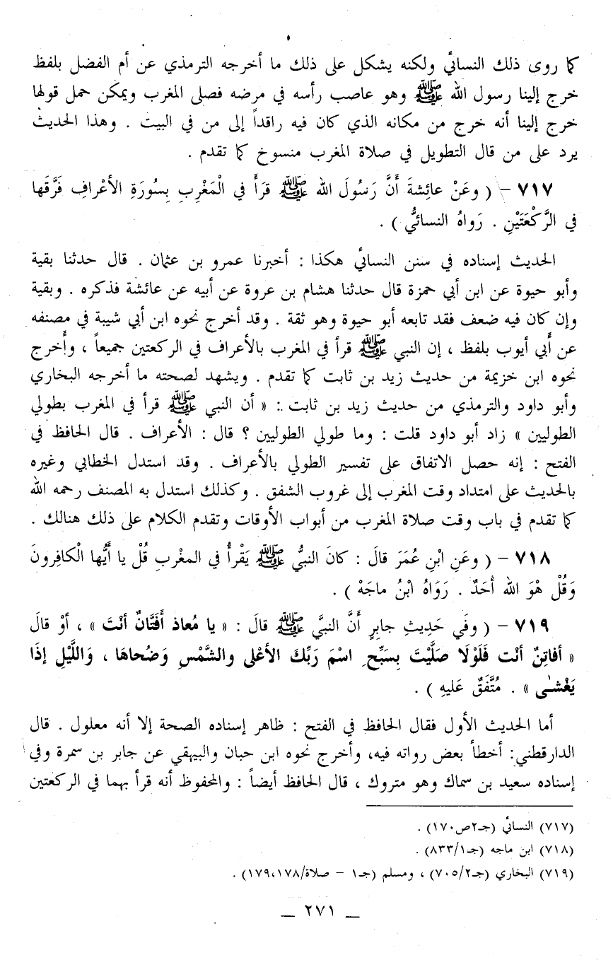 717 - (وَعَنْ عَائِشَةَ «أَنَّ رَسُولَ اللَّهِ - صَلَّى اللَّهُ عَلَيْهِ وَسَلَّمَ - قَرَأَ فِي الْمَغْرِبِ بِسُورَةِ الْأَعْرَافِ فَرَّقَهَا فِي الرَّكْعَتَيْنِ» . رَوَاهُ النَّسَائِيّ) . الْحَدِيثُ إسْنَادُهُ فِي سُنَنِ النَّسَائِيّ هَكَذَا: أَخْبَرَنَا عَمْرُو بْنُ عُثْمَانَ. قَالَ حَدَّثَنَا بَقِيَّةُ وَأَبُو حَيْوَةَ عَنْ ابْنِ أَبِي حَمْزَةَ قَالَ حَدَّثَنَا هِشَامُ بْنُ عُرْوَةَ عَنْ أَبِيهِ عَنْ عَائِشَةَ فَذَكَرَهُ. وَبَقِيَّةُ وَإِنْ كَانَ فِيهِ ضَعْفٌ فَقَدْ تَابَعَهُ أَبُو حَيْوَةَ وَهُوَ ثِقَةٌ. وَقَدْ أَخْرَجَ نَحْوَهُ ابْنُ أَبِي شَيْبَةَ فِي مُصَنَّفِهِ عَنْ أَبِي أَيُّوبَ بِلَفْظِ، «إنَّ النَّبِيَّ - صَلَّى اللَّهُ عَلَيْهِ وَسَلَّمَ - قَرَأَ فِي الْمَغْرِبِ بِالْأَعْرَافِ فِي الرَّكْعَتَيْنِ جَمِيعًا» ، وَأَخْرَجَ نَحْوَهُ ابْنُ خُزَيْمَةَ مِنْ حَدِيثِ زَيْدِ بْنِ ثَابِتٍ كَمَا تَقَدَّمَ. وَيَشْهَدُ لِصِحَّتِهِ مَا أَخْرَجَهُ الْبُخَارِيُّ وَأَبُو دَاوُد وَالتِّرْمِذِيُّ مِنْ حَدِيثِ زَيْدِ بْنِ ثَابِتٍ: «أَنَّ النَّبِيَّ - صَلَّى اللَّهُ عَلَيْهِ وَسَلَّمَ - قَرَأَ فِي الْمَغْرِبِ بِطُولَيْ الطُّولَيَيْنِ» زَادَ أَبُو دَاوُد قُلْتُ: وَمَا طُولَى الطُّولَيَيْنِ؟ قَالَ: الْأَعْرَافُ قَالَ الْحَافِظُ فِي الْفَتْحِ: إنَّهُ حَصَلَ الِاتِّفَاقُ عَلَى تَفْسِيرِ الطُّولَى بِالْأَعْرَافِ وَقَدْ اسْتَدَلَّ الْخَطَّابِيِّ وَغَيْرُهُ بِالْحَدِيثِ عَلَى امْتِدَادِ وَقْتِ الْمَغْرِبِ إلَى غُرُوبِ الشَّفَقِ