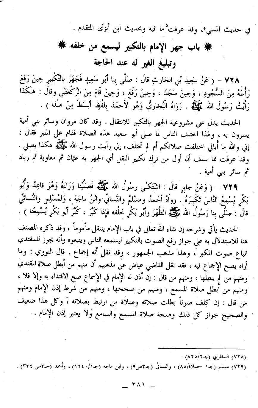729 - (وَعَنْ جَابِرٍ قَالَ: «اشْتَكَى رَسُولُ اللَّهِ - صَلَّى اللَّهُ عَلَيْهِ وَسَلَّمَ - فَصَلَّيْنَا وَرَاءَهُ وَهُوَ قَاعِدٌ وَأَبُو بَكْرٍ يُسْمِعُ النَّاسَ تَكْبِيرَهُ» . رَوَاهُ أَحْمَدُ وَمُسْلِمٌ وَالنَّسَائِيُّ وَابْنُ مَاجَهْ، وَلِمُسْلِمٍ وَالنَّسَائِيُّ قَالَ: «صَلَّى بِنَا رَسُولُ اللَّهِ - صَلَّى اللَّهُ عَلَيْهِ وَسَلَّمَ - الظُّهْرَ وَأَبُو بَكْرٍ خَلْفَهُ فَإِذَا كَبَّرَ، كَبَّرَ أَبُو بَكْرٍ يُسْمِعُنَا» .